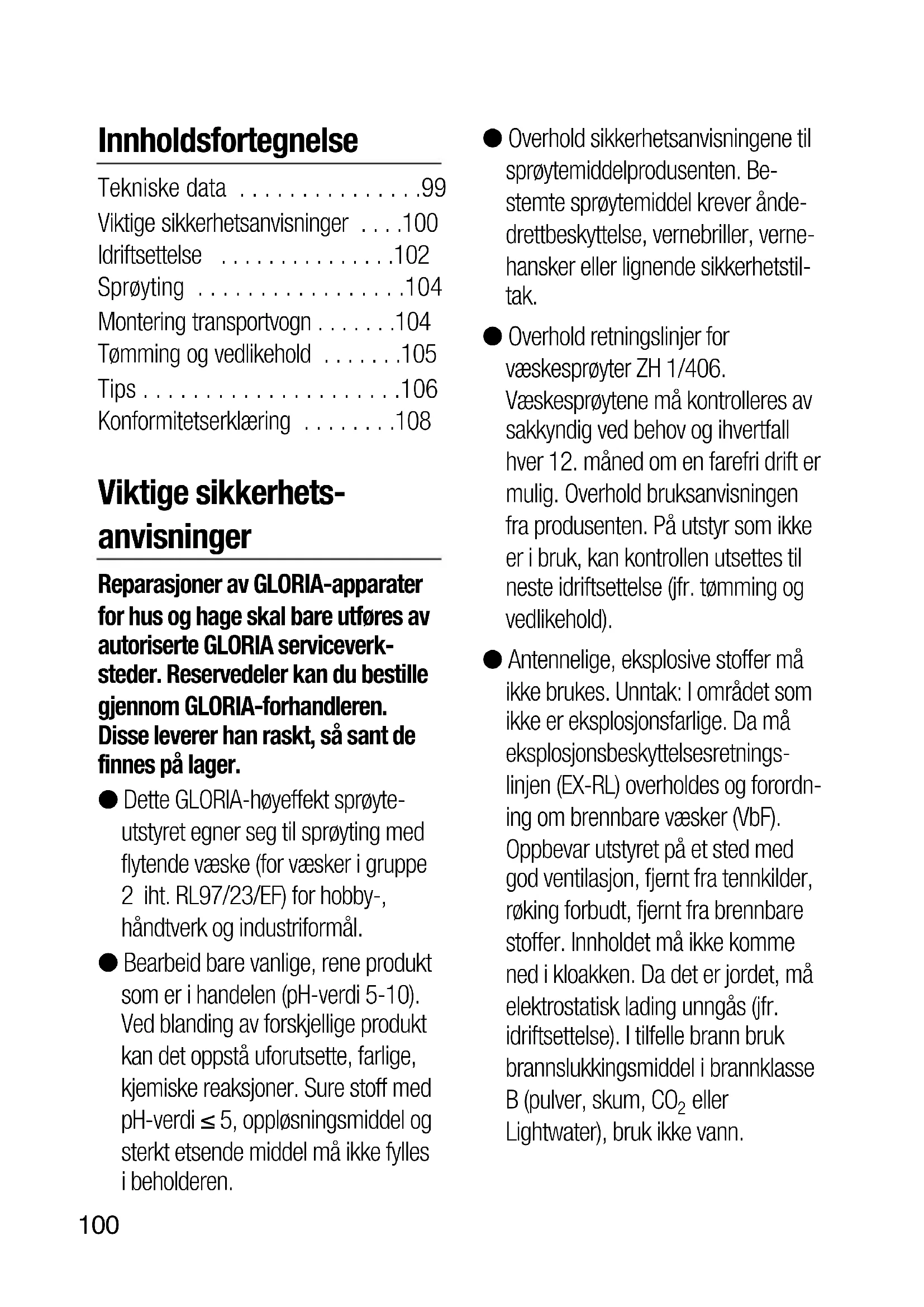 l Levetiden blir forlenget betydelig dersom pakningsringen mellom pumpe og beholder, samt den indre O-ringen, av og til blir innsatt med harpiks og syrefritt fett. l Beskytt apparatet mot frost. l Det er forbudt å foreta utbedrings- arbeid på beholderen (sveising, lodd- ing). l For å få til en optimal rengjøring av sprøyteapparatet og en sikker nøytr- alisering av sprøytemiddelrester, tilrår vi bruk av GLORIA spesial-aktivtkull, art. nr. 263.0000. l Viktig anvisning! Unormalt store påkjenninger på utstyret som følge av måten det brukes på (inkludert trans- port til bruksstedet og oppbevaring når det ikke er i bruk), påvirkninger fra omgivelsene (gjelder ruksstedet og oppbevaringsstedet) samt mangelfullt vedlikehold og leie, kan føre til unormal slitasje på apparatet. Det må i slike tilfeller kontrolleres nøye hver gang apparatet brukes, at det befinner seg i en trygg og driftssikker tilstand, og i det minste må det sjekkes for utvendige, synlige skader