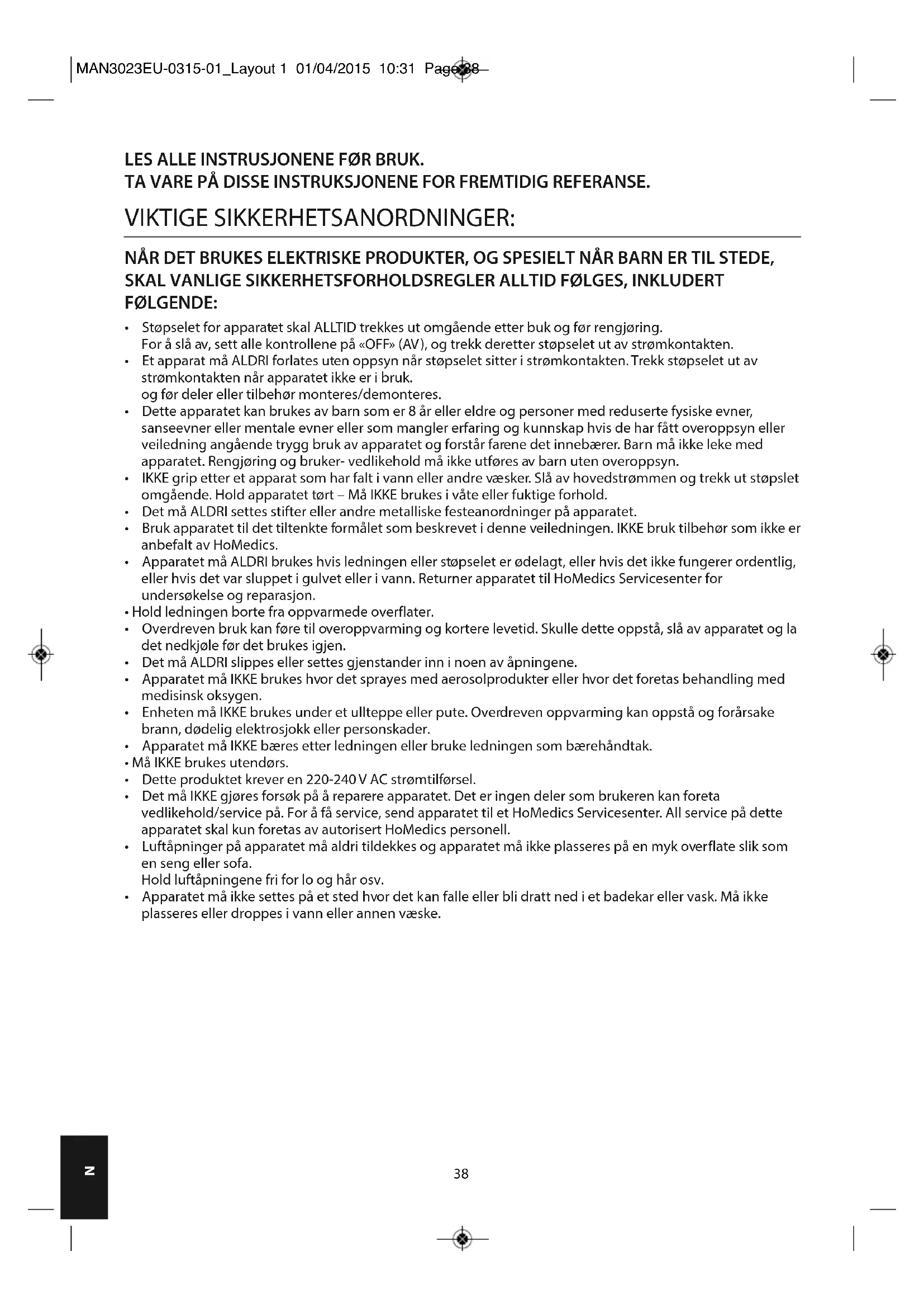 - Det må IKKE gjøres forsøk på å reparere apparatet. Det er ingen deler som brukeren kan foreta vedlikehold/service på. For å få service, send apparatet til et HoMedics Servicesenter. All service på dette apparatet skal kun foretas av autorisert HoMedics personell.