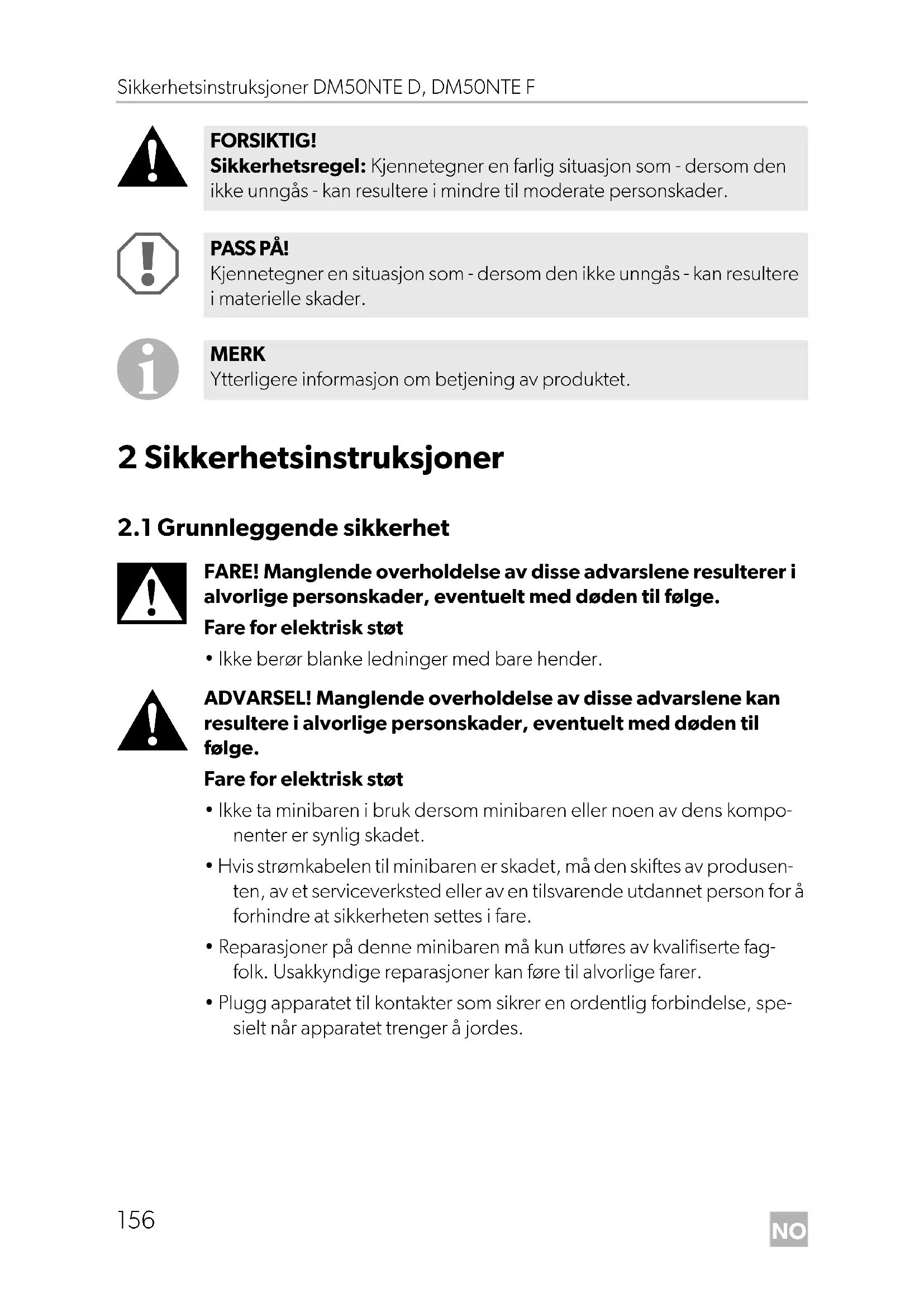 FARE! Sikkerhetsregel: Kjennetegner en farlig situasjon som - dersom den ikke unngås - resulterer i alvorlige personskader, eventuelt med døden til følge. ADVARSEL! Sikkerhetsregel: Kjennetegner en farlig situasjon som - dersom den ikke unngås - kan resultere i alvorlige personskader, eventuelt med døden til følge.NO Sikkerhetsinstruksjoner DM50NTE D, DM50NTE F