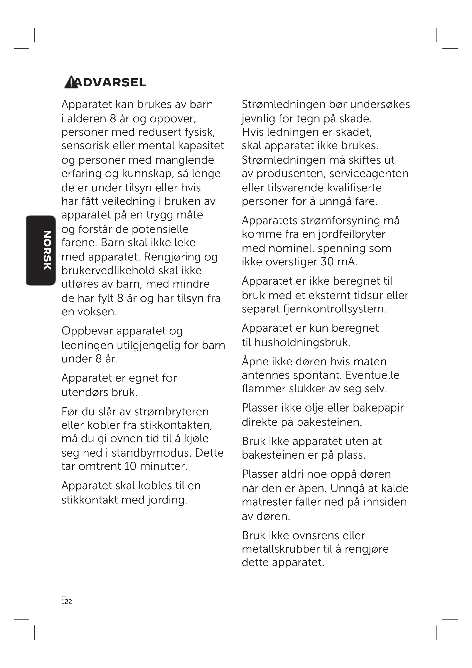 NEDERLANDS122 ADVARSEL Apparatet kan brukes av barn i alderen 8 år og oppover, personer med redusert fysisk, sensorisk eller mental kapasitet og personer med manglende erfaring og kunnskap, så lenge de er under tilsyn eller hvis har fått veiledning i bruken av apparatet på en trygg måte og forstår de potensielle farene. Barn skal ikke leke med apparatet. Rengjøring og brukervedlikehold skal ikke utføres av barn, med mindre de har fylt 8 år og har tilsyn fra en voksen. Oppbevar apparatet og ledningen utilgjengelig for barn under 8 år. Apparatet er egnet for utendørs bruk. Før du slår av strømbryteren eller kobler fra stikkontakten, må du gi ovnen tid til å kjøle seg ned i standbymodus. Dette tar omtrent 10 minutter. Apparatet skal kobles til en stikkontakt med jording. Strømledningen bør undersøkes jevnlig for tegn på skade. Hvis ledningen er skadet, skal apparatet ikke brukes. Strømledningen må skiftes ut av produsenten, serviceagenten eller tilsvarende kvalifiserte personer for å unngå fare. Apparatets strømforsyning må komme fra en jordfeilbryter med nominell spenning som ikke overstiger 30mA. Apparatet er ikke beregnet til bruk med et eksternt tidsur eller separat ernkontrollsystem. Apparatet er kun beregnet til husholdningsbruk. Åpne ikke døren hvis maten antennes spontant. Eventuelle flammer slukker av seg selv. Plasser ikke olje eller bakepapir direkte på bakesteinen. Bruk ikke apparatet uten at bakesteinen er på plass. Plasser aldri noe oppå døren når den er åpen. Unngå at kalde matrester faller ned på innsiden av døren. Bruk ikke ovnsrens eller metallskrubber til å rengjøre dette apparatet. NORSK123 Bruk ikke slanger eller høyttrykkspylere til å rengjøre dette apparatet. Oppbevar bare bakesteinen inne i ovnen. Ikke len eller sett gjenstander oppå ovnen. Dette apparatet kan brukes opptil 3000 meter over havet. Dette apparatet genererer varme under bruk. Berør ikke varme overfl ater. Bruk håndtak eller knotter. Beskytt alltid hendene dine med grytekluter eller lignende. NORSK124