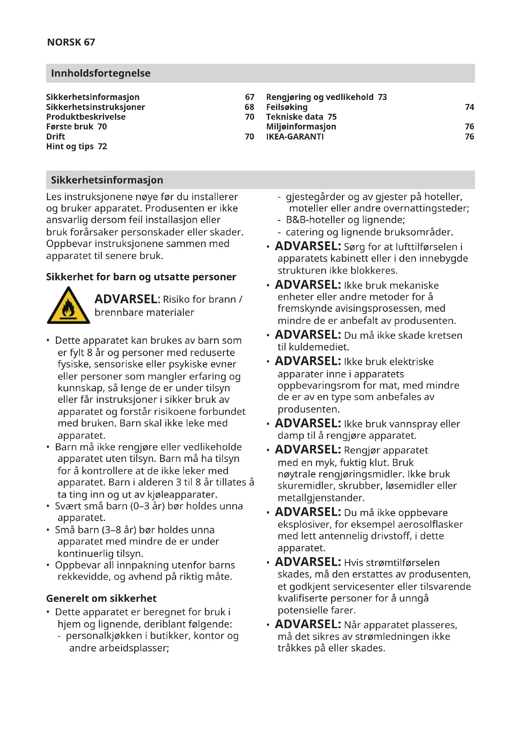 - ADVARSEL: Når apparatet plasseres, må det sikres av strømledningen ikke tråkkes på eller skades. Sikkerhetsinformasjon 67 Sikkerhetsinstruksjoner 68 Produktbeskrivelse 70 Første bruk 70 Drift 70 Hint og tips 72 Rengjøring og vedlikehold 73 Feilsøking 74 Tekniske data 75 Miljøinformasjon 76 IKEA-GARANTI 76NORSK 68