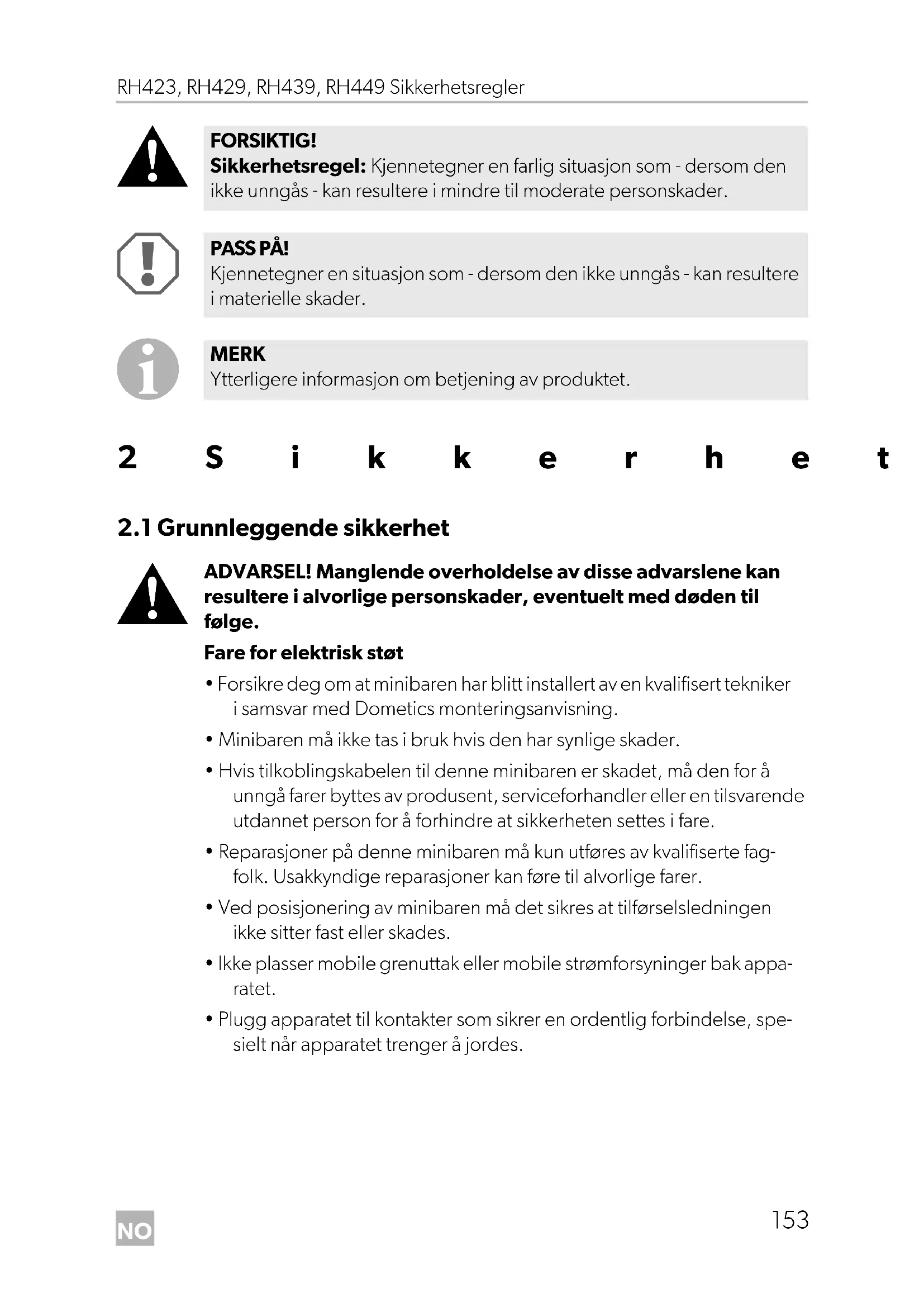 - Avløpsåpningen må holdes ren.NO RH423, RH429, RH439, RH449 Sikkerhetsregler