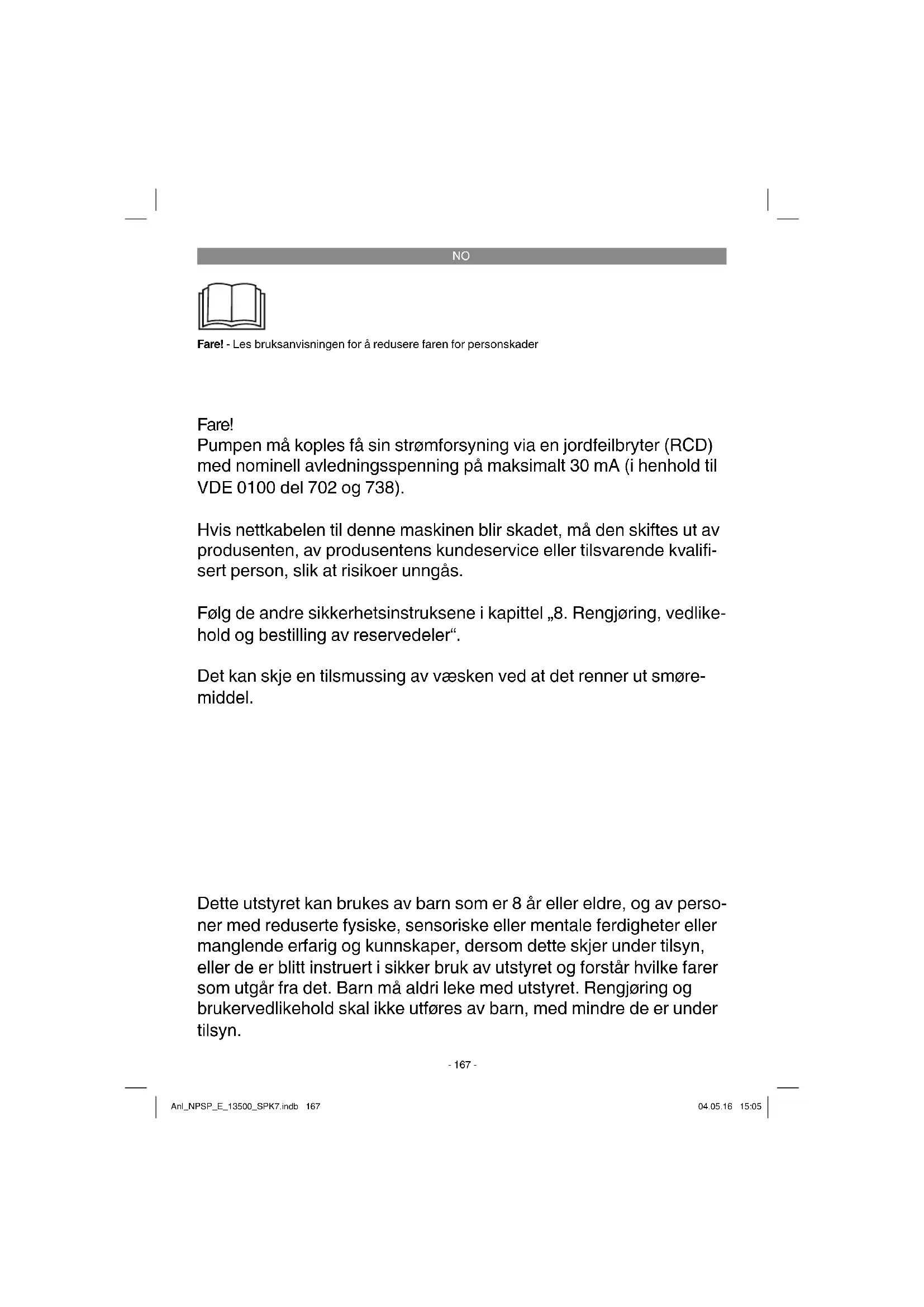 Fare! - Les bruksanvisningen for å redusere faren for personskader Dette utstyret kan brukes av barn som er 8 år eller eldre, og av perso- ner med reduserte fysiske, sensoriske eller mentale ferdigheter eller manglende erfarig og kunnskaper, dersom dette skjer under tilsyn, eller de er blitt instruert i sikker bruk av utstyret og forstår hvilke farer som utgår fra det. Barn må aldri leke med utstyret. Rengjøring og brukervedlikehold skal ikke utføres av barn, med mindre de er under tilsyn. Fare! Pumpen må koples få sin strømforsyning via en jordfeilbryter (RCD) med nominell avledningsspenning på maksimalt 30 mA (i henhold til VDE 0100 del 702 og 738). Hvis nettkabelen til denne maskinen blir skadet, må den skiftes ut av produsenten, av produsentens kundeservice eller tilsvarende kvalifi - sert person, slik at risikoer unngås. Følg de andre sikkerhetsinstruksene i kapittel „8. Rengjøring, vedlike- hold og bestilling av reservedeler“. Det kan skje en tilsmussing av væsken ved at det renner ut smøre- middel. Anl_NPSP_E_13500_SPK7.indb 167Anl_NPSP_E_13500_SPK7.indb 167 04.05.16 15:0504.05.16 15:05NO