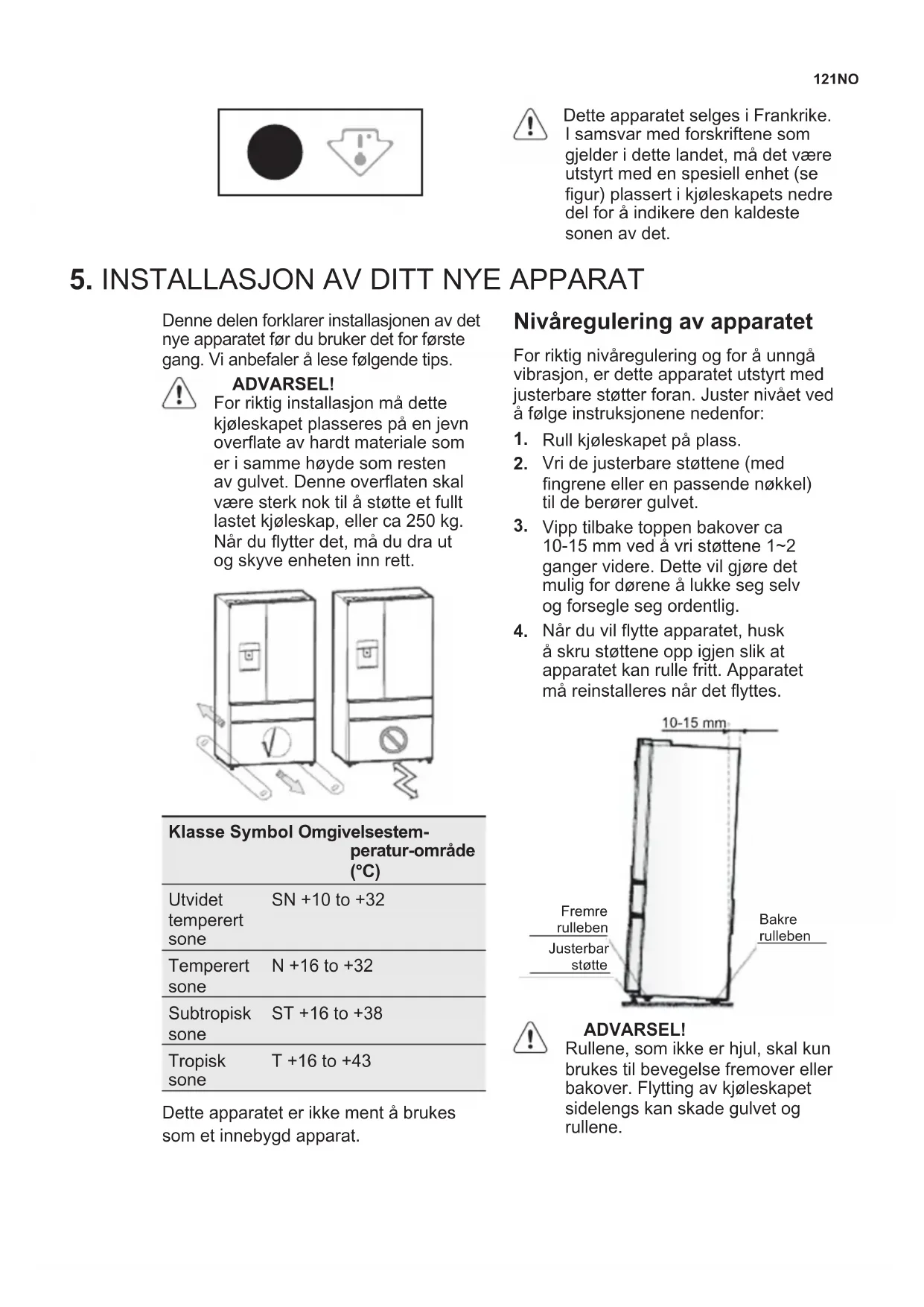 Denne delen forklarer installasjonen av det nye apparatet før du bruker det for første gang. Vi anbefaler å lese følgende tips. ADVARSEL! For riktig installasjon må dette kjøleskapet plasseres på en jevn overateavhardtmaterialesom er i samme høyde som resten avgulvet.Denneoveratenskal væresterknoktilåstøtteetfullt lastet kjøleskap, eller ca 250 kg. Nårduytterdet,mådudraut og skyve enheten inn rett. Klasse Symbol Omgivelsestem- peratur-område (°C) Utvidet temperert sone SN +10 to +32 Temperert sone N +16 to +32 Subtropisk sone ST +16 to +38 Tropisk sone T +16 to +43 Dette apparatet er ikke ment å brukes som et innebygd apparat. Nivåregulering av apparatet For riktig nivåregulering og for å unngå vibrasjon, er dette apparatet utstyrt med justerbare støtter foran. Juster nivået ved å følge instruksjonene nedenfor: