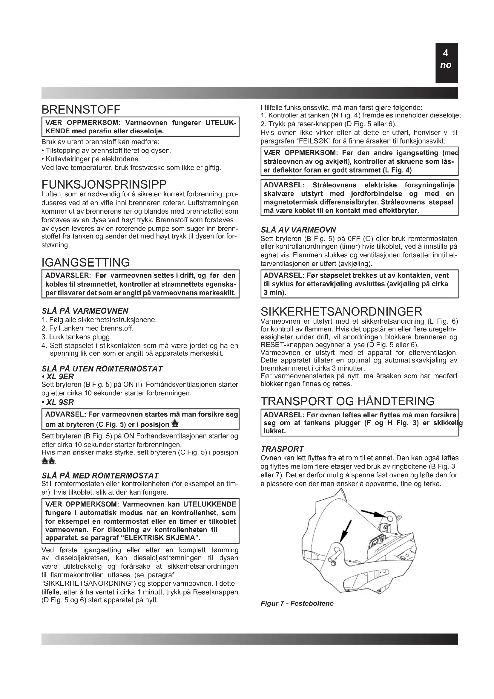 - Påfylling: a) Personer som fyller brennsto må være kvaliserte og ha grundig kjennskap til instruksjonene fra produsenten, samt ak- tuelle retningslinjer for påfylling av brennsto i varmeovnene. b) Bruk kun brennsto av den type som angitt på varmeovnens merkeskilt. c) Før fylling utføres, slukk alle ammer og vent til varmeovnen avkjøles. d) Under påfylling skal alle brennstoslanger og koblinger kon- trolleres for lekkasjer. Eventuelle lekkasjer skal repareres før varmeovnen settes i drift. e) Det må aldri oppbevares mer enn en dagsforsyning brennst- o i nærheten av varmeovnen inne i en bygning. Brennsto- tankene må oppbevares på et annet sted. f) Alle brennstotanker skal plasseres i en minimums sikker- hetsavstand (iht. gjeldende normer) fra varmeapparater, svei- seutstyr og andre lett antennelige kilder (med unntak av drivs- totanken som er innebygd i varmeovnen). g) Brennstoet skal oppbevares på steder der væsken ikke kan trenge gjennom gulvet eller bli antent av en brann i underetas- jen. h) Brennsto skal oppbevares iht. gjeldende regelverk.