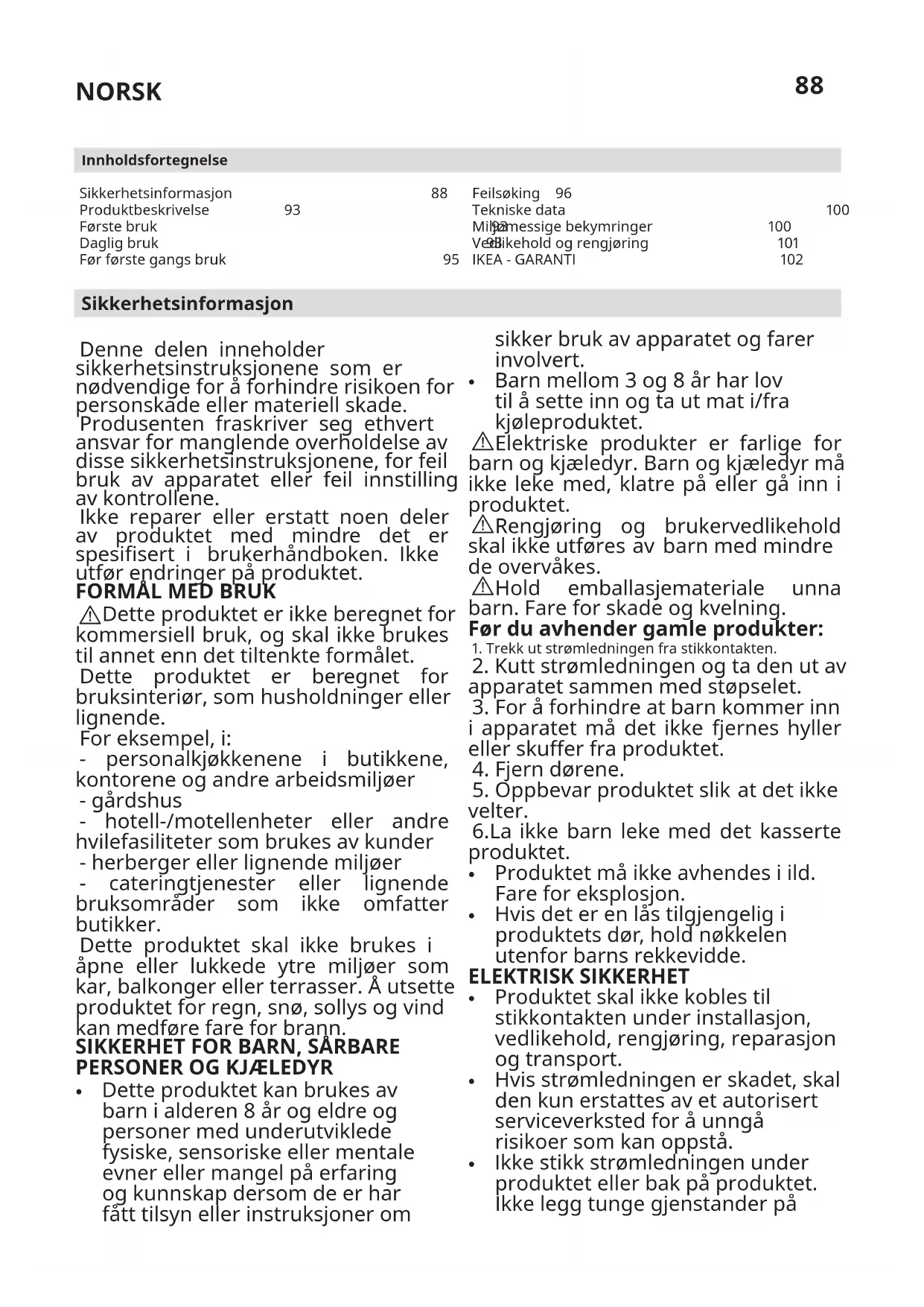 dekkes ikke av denne garantien?» Innenfor garantiperioden dekkes kostnadene for å utbedre feilen, f.eks. reparasjoner, deler, arbeid og reiser, forutsatt at apparatet er tilgjengelig for reparasjon uten spesielle utgifter. På disse forholdene gjelder EU- retningslinjene (Nr. 99/44/EG) og de respektive lokale forskriftene. Utskiftede deler blir IKEAs eiendom. Hva vil IKEA gjøre for å løse problemet? IKEA-oppnevnt serviceleverandør vil undersøke produktet og avgjøre, etter eget skjønn, om det dekkes av denne garantien. Hvis det anses som dekket, vil IKEA- serviceleverandøren eller dens autoriserte servicepartner gjennom sine egne serviceoperasjoner, etter eget skjønn, enten reparere det defekte produktet eller erstatte det med det samme eller et sammenlignbart produkt. Hva dekkes ikke av denne garantien?