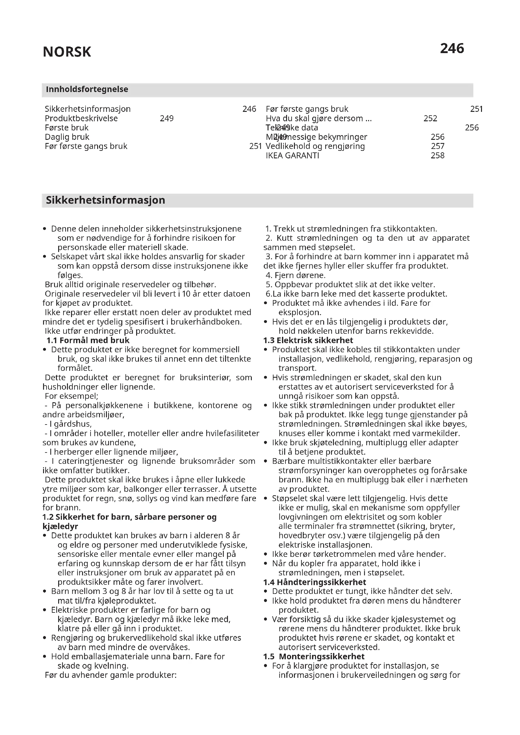 Sikkerhetsinformasjon 246 Produktbeskrivelse 249 Første bruk 249 Daglig bruk 249 Før første gangs bruk 251 Innholdsfortegnelse Før første gangs bruk 251 Hva du skal gjøre dersom ... 252 Tekniske data 256 Miljømessige bekymringer 256 Vedlikehold og rengjøring 257 IKEA GARANTI 258247 NORSK at nødvendig strøm- og vanntilførsel er på plass. Hvis installasjonen ikke er egnet, ring en kvalifisert elektriker og rørlegger for å få dem til å ordne det nødvendige. Ellers kan det oppstå elektrisk støt, brann, problemer med produktet eller skader.