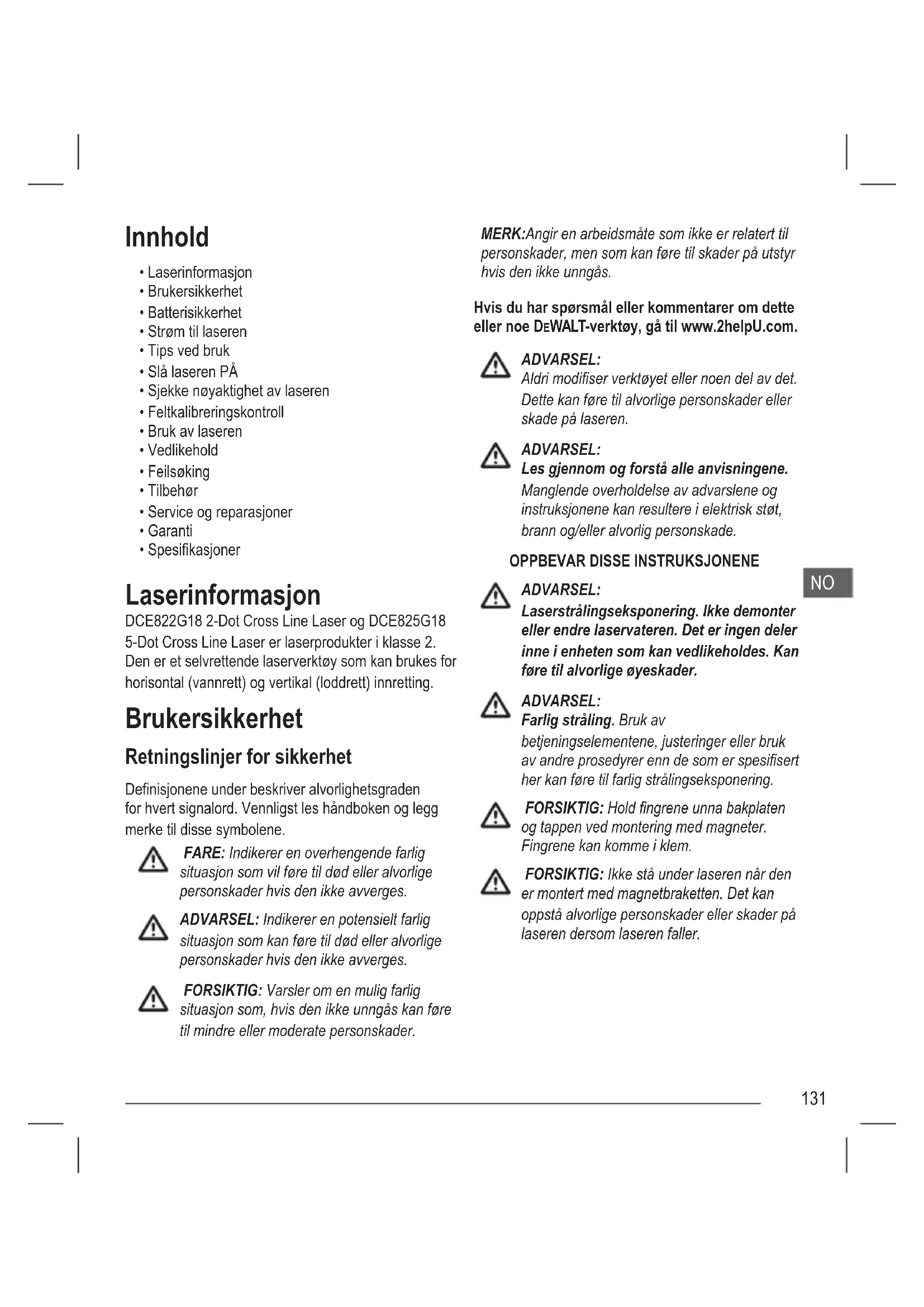- Spesikasjoner Laserinformasjon DCE822G18 2-Dot Cross Line Laser og DCE825G18 5-Dot Cross Line Laser er laserprodukter i klasse 2. Den er et selvrettende laserverktøy som kan brukes for horisontal (vannrett) og vertikal (loddrett) innretting. Brukersikkerhet Retningslinjer for sikkerhet Denisjonene under beskriver alvorlighetsgraden for hvert signalord. Vennligst les håndboken og legg merke til disse symbolene. FARE: Indikerer en overhengende farlig situasjon som vil føre til død eller alvorlige personskader hvis den ikke avverges. ADVARSEL: Indikerer en potensielt farlig situasjon som kan føre til død eller alvorlige personskader hvis den ikke avverges. FORSIKTIG: Varsler om en mulig farlig situasjon som, hvis den ikke unngås kan føre til mindre eller moderate personskader. MERK: Angir en arbeidsmåte som ikke er relatert til personskader, men som kan føre til skader på utstyr hvis den ikke unngås. Hvis du har spørsmål eller kommentarer om dette eller noe DEWALT-verktøy, gå til www.2helpU.com. ADVARSEL: Aldri modiser verktøyet eller noen del av det. Dette kan føre til alvorlige personskader eller skade på laseren. ADVARSEL: Les gjennom og forstå alle anvisningene. Manglende overholdelse av advarslene og instruksjonene kan resultere i elektrisk støt, brann og/eller alvorlig personskade.