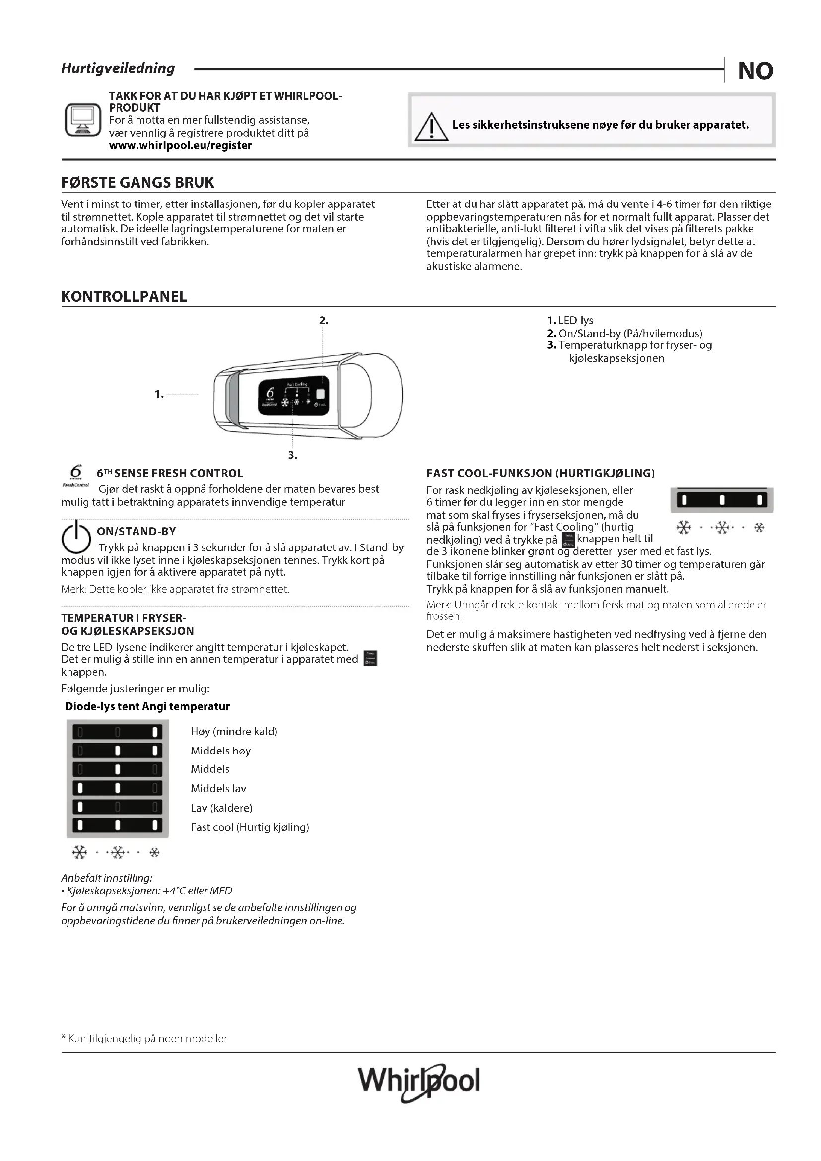 Gjør det raskt å oppnå forholdene der maten bevares best mulig tatt i betraktning apparatets innvendige temperatur ON/STAND-BY Trykk på knappen i 3 sekunder for å slå apparatet av. I Stand-by modus vil ikke lyset inne i kjøleskapseksjonen tennes. Trykk kort på knappen igjen for å aktivere apparatet på nytt. Merk: Dette kobler ikke apparatet fra strømnettet.