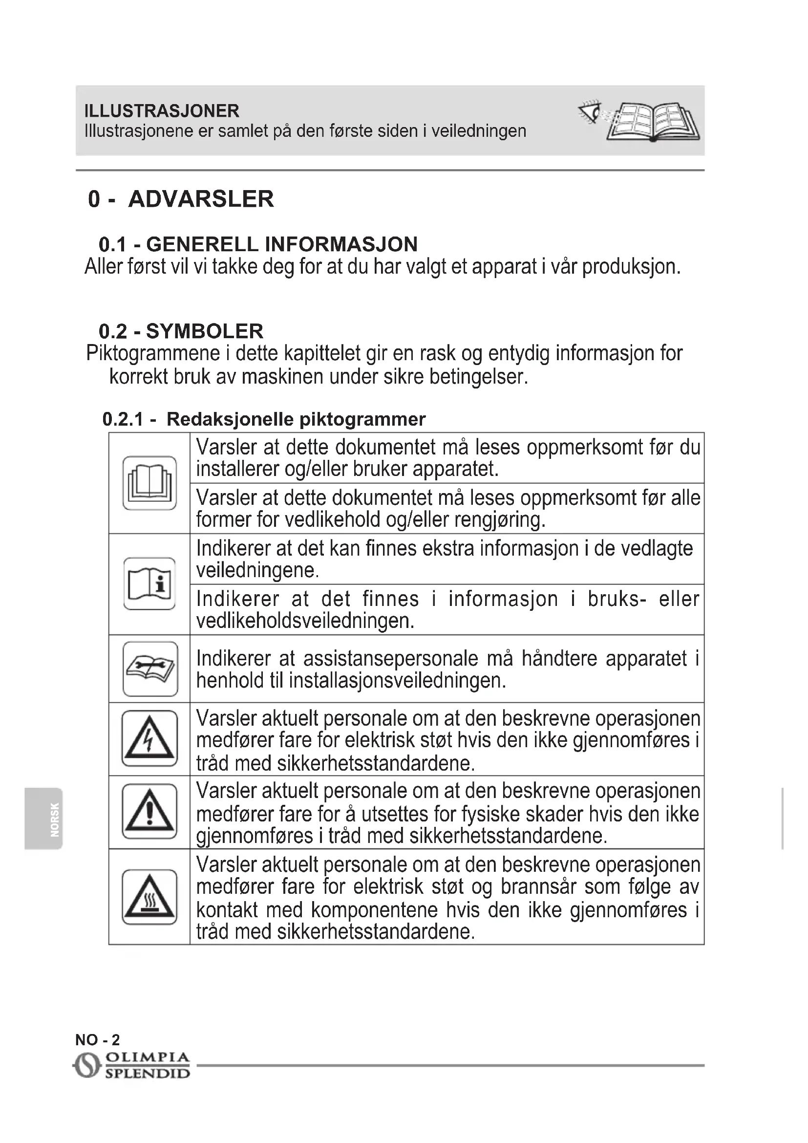 Avsnittene som følger etter dette symbolet inneholder svært viktig informasjon og påbud, særlig hva angår sikkerheten. Manglende respekt for dette vil kunne medføre: - fare for operatørenes sikkerhet - bortfall av garantien - fraskrivelse av alt ansvar fra produsentens side. Merker handlinger som man absolutt ikke må foreta seg. Varsler aktuelt personale om at det er forbudt å dekke til apparatet for å unngå overoppvarming. VED BRUK AV ELEKTRISKE APPARATER MÅ MAN ALLTID FØL-