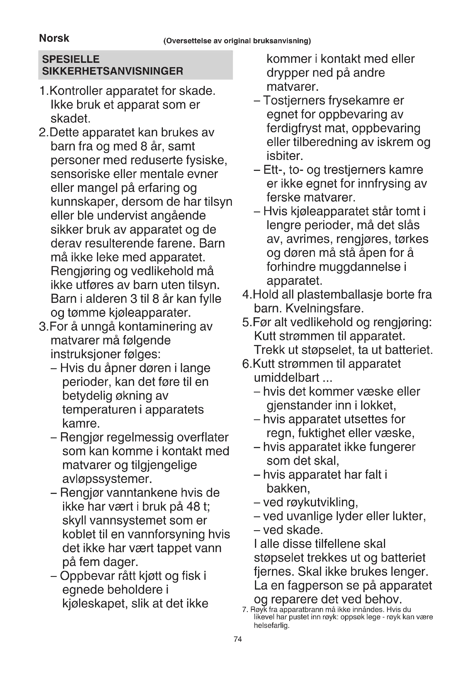 SPESIELLE SIKKERHETSANVISNINGER 1.Kontroller apparatet for skade. Ikke bruk et apparat som er skadet. 2.Dette apparatet kan brukes av barn fra og med 8 år, samt personer med reduserte fysiske, sensoriske eller mentale evner eller mangel på erfaring og kunnskaper, dersom de har tilsyn eller ble undervist angående sikker bruk av apparatet og de derav resulterende farene. Barn må ikke leke med apparatet. Rengjøring og vedlikehold må ikke utføres av barn uten tilsyn. Barn i alderen 3 til 8 år kan fylle og tømme kjøleapparater. 3.For å unngå kontaminering av matvarer må følgende instruksjoner følges: – Hvis du åpner døren i lange perioder, kan det føre til en betydelig økning av temperaturen i apparatets kamre. – Rengjør regelmessig overflater som kan komme i kontakt med matvarer og tilgjengelige avløpssystemer. – Rengjør vanntankene hvis de ikke har vært i bruk på 48 t; skyll vannsystemet som er koblet til en vannforsyning hvis det ikke har vært tappet vann på fem dager. – Oppbevar rått kjøtt og fisk i egnede beholdere i kjøleskapet, slik at det ikke kommer i kontakt med eller drypper ned på andre matvarer. – Tostjerners frysekamre er egnet for oppbevaring av ferdigfryst mat, oppbevaring eller tilberedning av iskrem og isbiter. – Ett-, to- og trestjerners kamre er ikke egnet for innfrysing av ferske matvarer. – Hvis kjøleapparatet står tomt i lengre perioder, må det slås av, avrimes, rengjøres, tørkes og døren må stå åpen for å forhindre muggdannelse i apparatet. 4.Hold all plastemballasje borte fra barn. Kvelningsfare. 5.Før alt vedlikehold og rengjøring: Kutt strømmen til apparatet. Trekk ut støpselet, ta ut batteriet. 6.Kutt strømmen til apparatet umiddelbart ... – hvis det kommer væske eller gjenstander inn i lokket, – hvis apparatet utsettes for regn, fuktighet eller væske, – hvis apparatet ikke fungerer som det skal, – hvis apparatet har falt i bakken, – ved røykutvikling, – ved uvanlige lyder eller lukter, – ved skade. I alle disse tilfellene skal støpselet trekkes ut og batteriet fjernes. Skal ikke brukes lenger. La en fagperson se på apparatet og reparere det ved behov.
