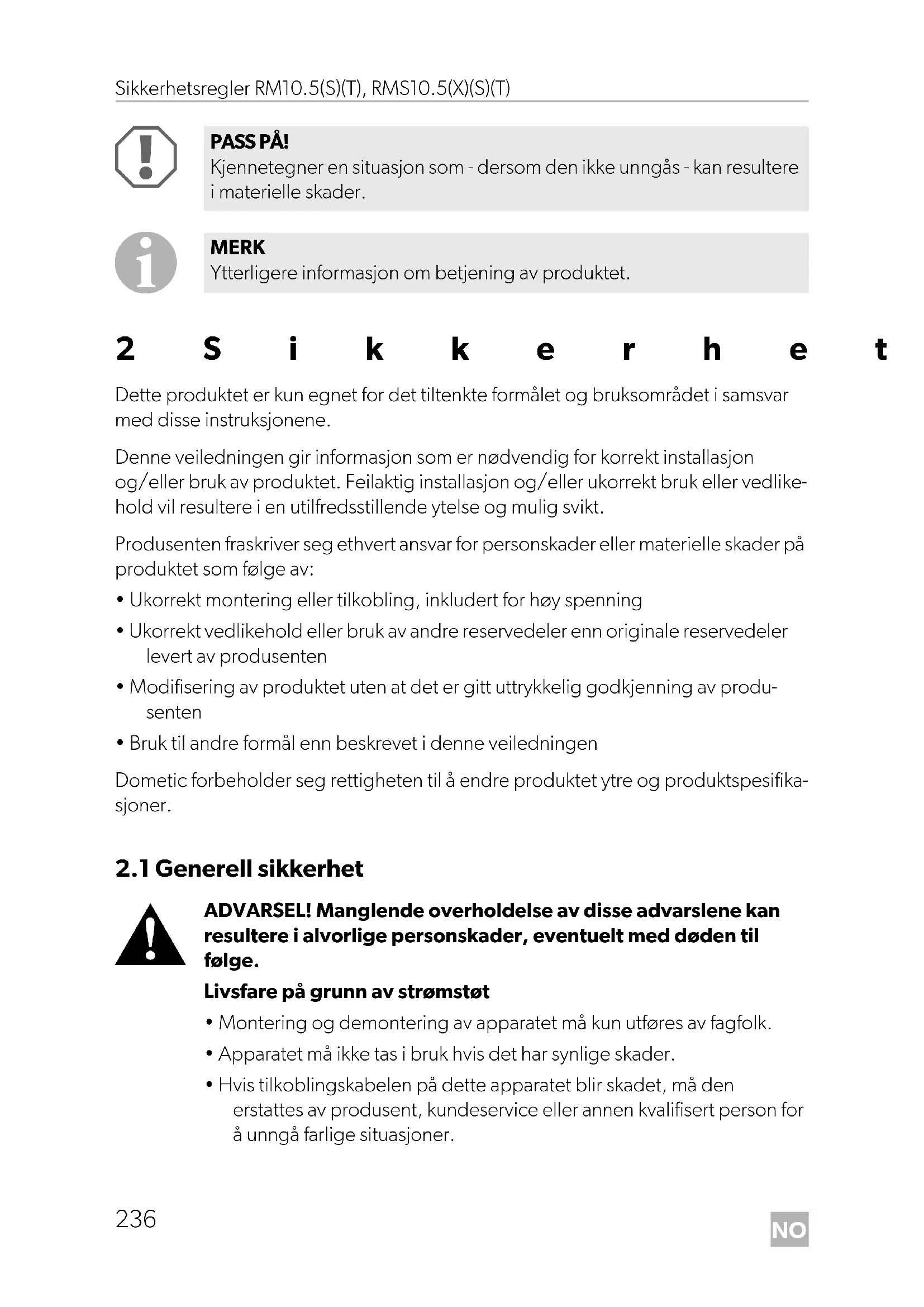 - Hvis tilkoblingskabelen på dette apparatet blir skadet, må den erstattes av produsent, kundeservice eller annen kvalifisert person for å unngå farlige situasjoner. PASS PÅ! Kjennetegner en situasjon som - dersom den ikke unngås - kan resultere i materielle skader. MERK Ytterligere informasjon om betjening av produktet.NO RM10.5(S)(T), RMS10.5(X)(S)(T) Sikkerhetsregler