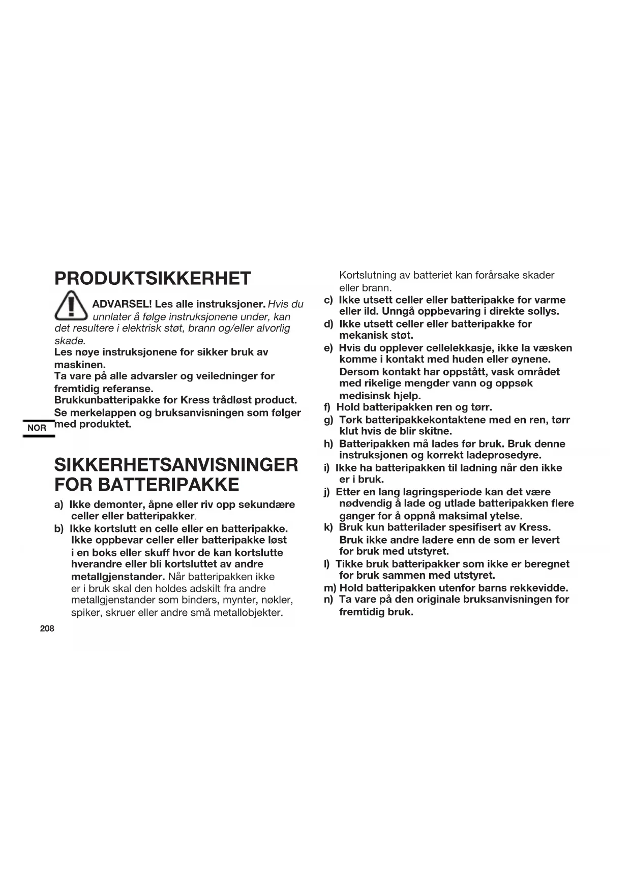 er i bruk. j) Etter en lang lagringsperiode kan det være nødvendig å lade og utlade batteripakken flere ganger for å oppnå maksimal ytelse. k) Bruk kun batterilader spesifisert av Kress. Bruk ikke andre ladere enn de som er levert for bruk med utstyret. l) Tikke bruk batteripakker som ikke er beregnet for bruk sammen med utstyret. m) Hold batteripakken utenfor barns rekkevidde. n) Ta vare på den originale bruksanvisningen for fremtidig bruk.209 NOR o) Ta ut batteriene fra utstyret når det ikke er i bruk. p) Kvitt deg med produktet på forsvarlig måte. q) Ikke bland batterier av forskjellig produksjon, kapasitet, størrelse eller type i enheten. r) Hold batteriet unna mikrobølger og høyt trykk. s) Advarsel! Ikke bruk ikke-oppladbare batterier. YTTERLIGERE SIKKERHETSADVARSEL FOR KOMMERSIELL BATTERIPAKKE