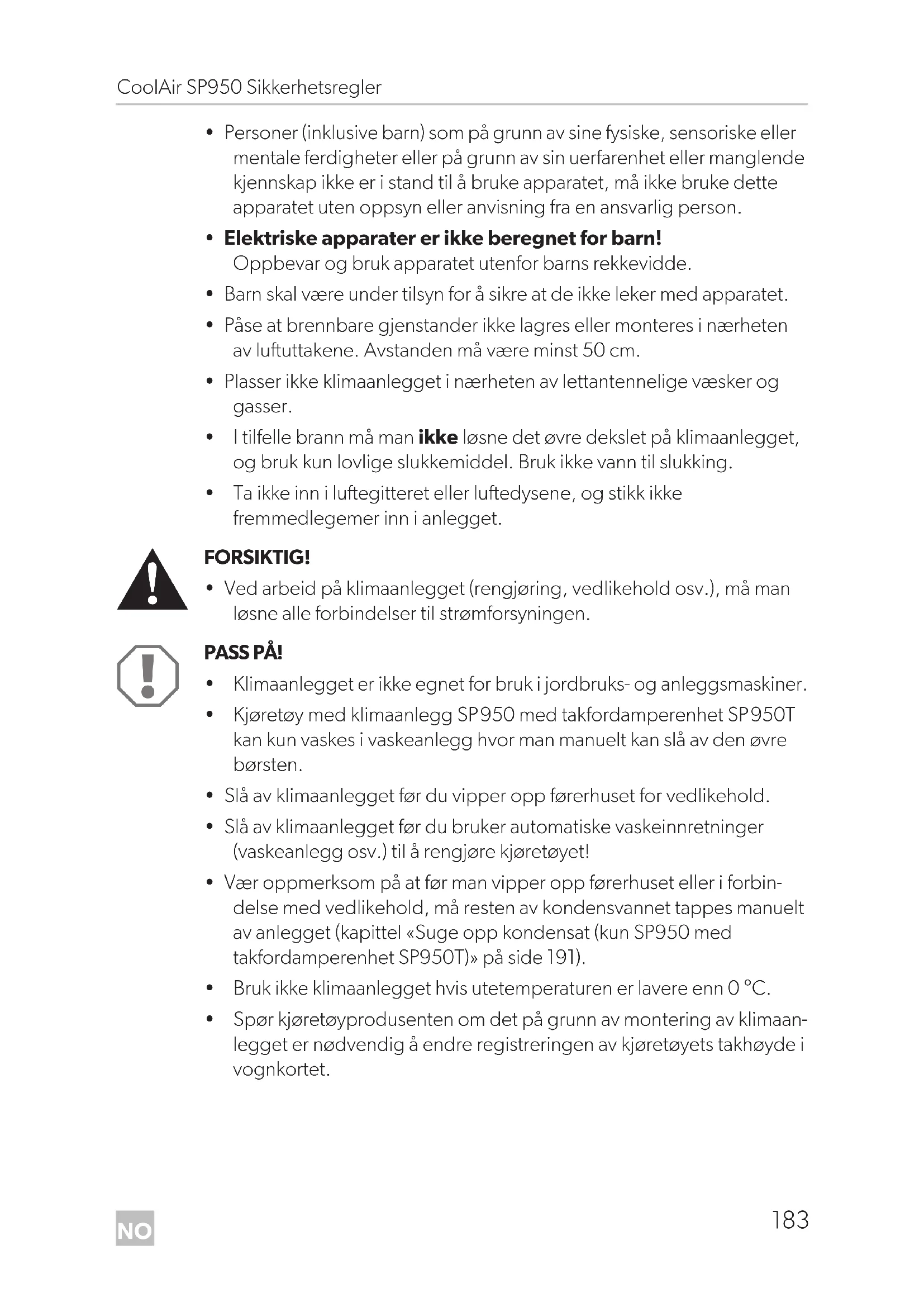 - Spør kjøretøyprodusenten om det på grunn av montering av klimaan- legget er nødvendig å endre registreringen av kjøretøyets takhøyde i vognkortet. SP950-O-16s.book Seite 183 Freitag, 24. Februar 2017 4:26 16NO Målgruppe CoolAir SP950