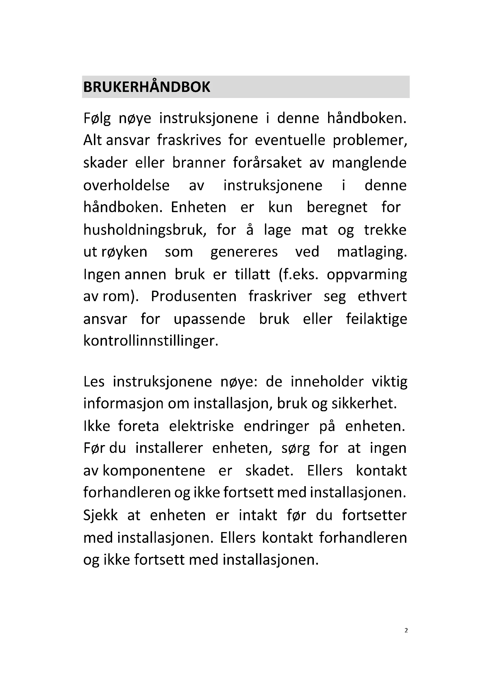 PRODUKTINSTALLASJON ........................................................................................ 32 ELEKTRISK TILKOBLING .......................................................................................... 352 BRUKERHÅNDBOK Følg nøye instruksjonene i denne håndboken. Alt ansvar fraskrives for eventuelle problemer, skader eller branner forårsaket av manglende overholdelse av instruksjonene i denne håndboken. Enheten er kun beregnet for husholdningsbruk, for å lage mat og trekke ut røyken som genereres ved matlaging. Ingen annen bruk er tillatt (f.eks. oppvarming av rom). Produsenten fraskriver seg ethvert ansvar for upassende bruk eller feilaktige kontrollinnstillinger. Les instruksjonene nøye: de inneholder viktig informasjon om installasjon, bruk og sikkerhet. Ikke foreta elektriske endringer på enheten. Før du installerer enheten, sørg for at ingen av komponentene er skadet. Ellers kontakt forhandleren og ikke fortsett med installasjonen. Sjekk at enheten er intakt før du fortsetter med installasjonen. Ellers kontakt forhandleren og ikke fortsett med installasjonen.3