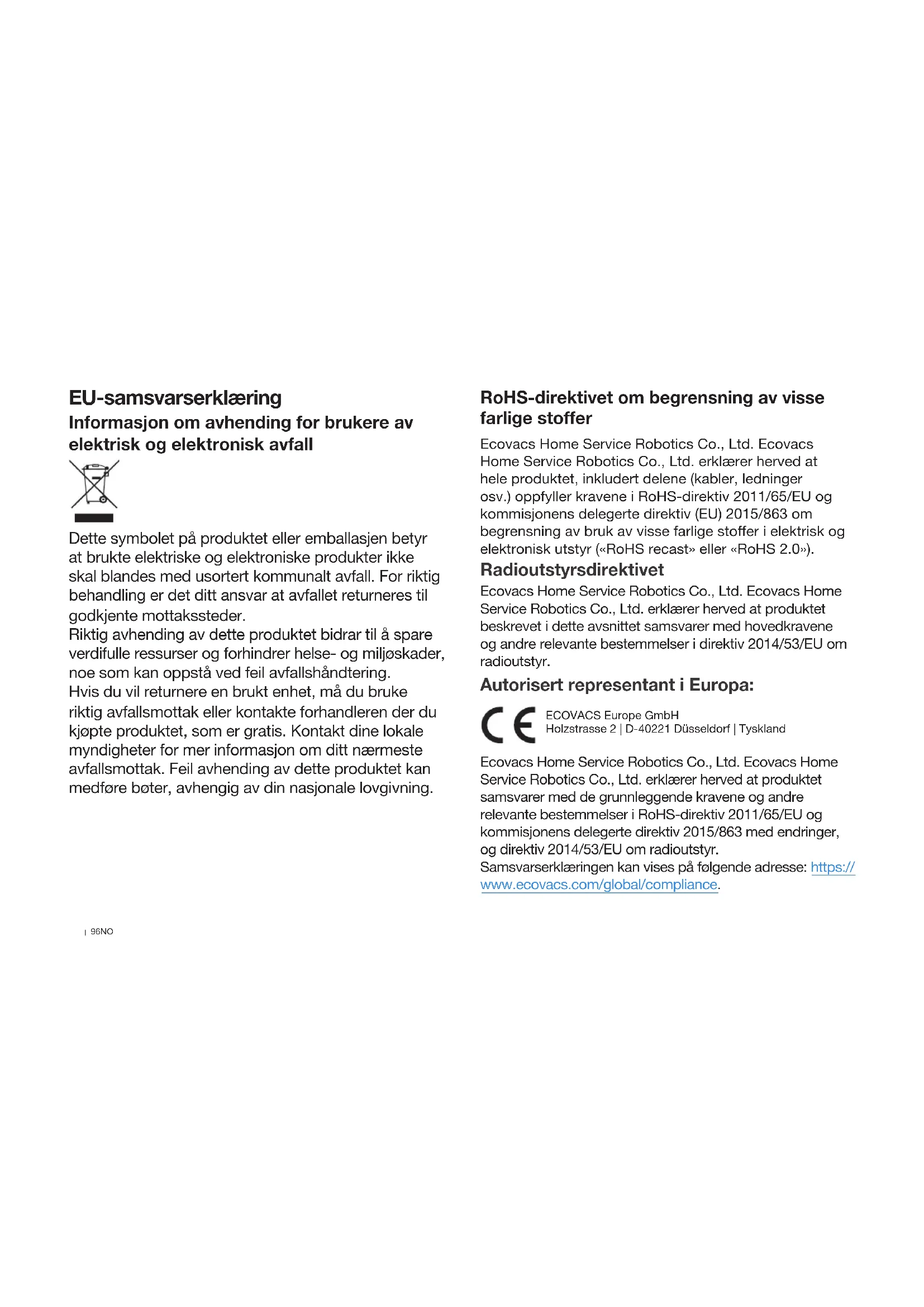 Rengjøringsoppgaven blir ikke utført til planlagt tid. Den planlagte økten er avbrutt. Planlegg rengjøringsoppgaven på nytt. Robotens batterinivå er lavt. Lad batteriet. Roboten er i Ikke foryrr-modus. Roboten kan ikke utføre planlagt rengjøring når den er i Ikke foryrr-modus.110NO TEKNISKE SPESIFIKASJONER Bruk mobilkameraet til å skanne QR-koden og få brukerhåndboken. Merk: Tekniske spesikasjoner og design kan endres fortløpende for å forbedre produktet. Du nner mer tilbehør på https://www.ecovacs.com. Utgangseffekten til Wi-Fi-modulen er mindre enn 100mW. Modell DKX55/DKX56 Nominell inngang 20V 1A Ladetid 6,5t Automatisk tømmestasjon CH2403 Nominell inngang 220–240V