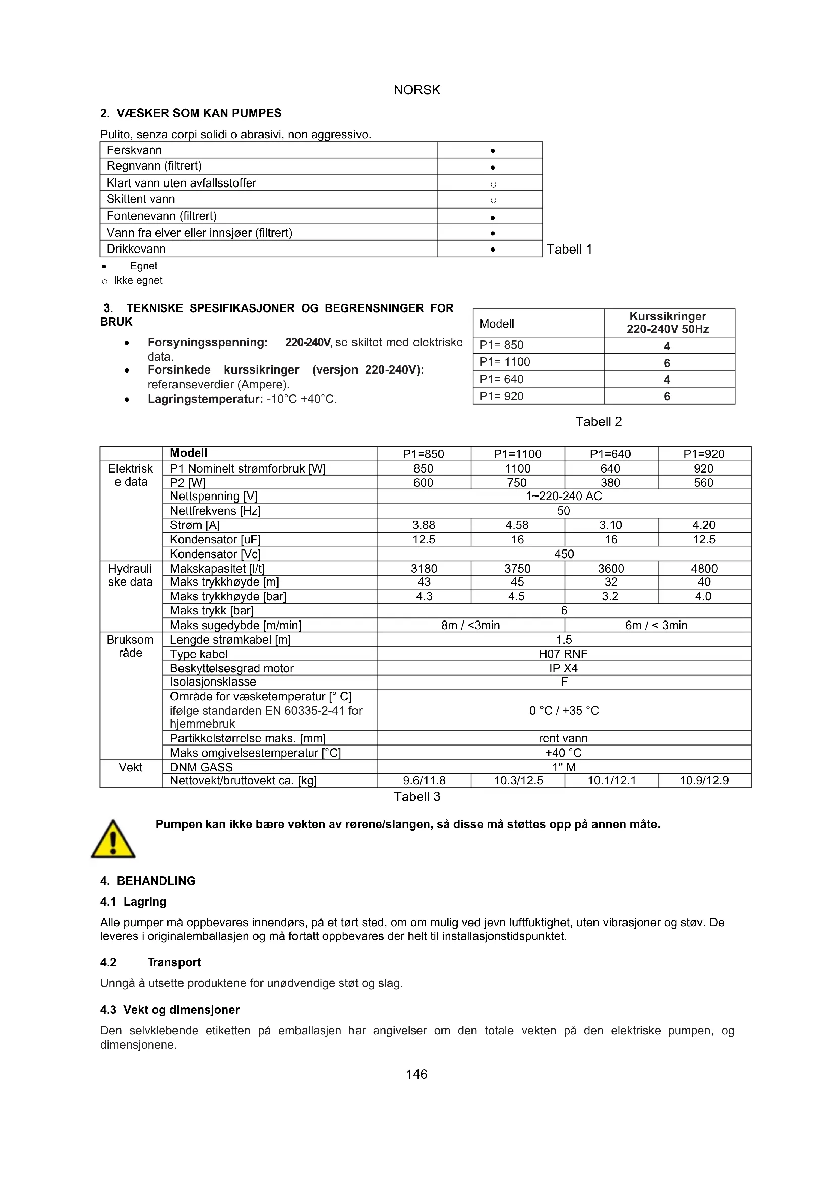 Disse pumpene kan ikke brukes i svømmebasseng, dammer, reservoarer der det er personer tilstede, eller til å pumpe hydrokarboner (bensin, diesel, fyringsoljer, løsemidler, etc.) i samsvar med gjeldende sikkerhetsforskrifter. Før man setter pumpen på lager, anbefales det å rengjøre den. Se kapittelet «Rengjøring og vedlikehold».NORSK