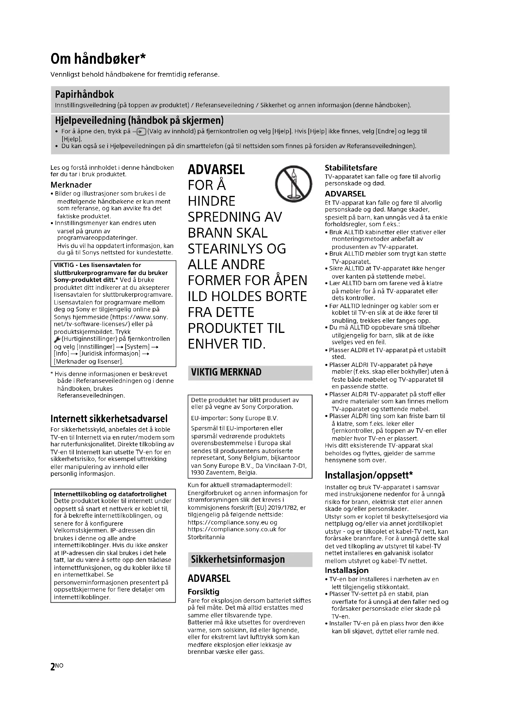 FRA DETTE PRODUKTET TIL ENHVER TID. Kun for aktuell strømadaptermodell:Energiforbruket og annen informasjon for strømforsyningen slik det kreves i kommisjonens forskrift (EU) 2019/1782, er tilgjengelig på følgende nettside:https://compliance.sony.eu oghttps://compliance.sony.co.uk for Storbritannia ADVARSEL Forsiktig Fare for eksplosjon dersom batteriet skiftes på feil måte. Det må alltid erstattes med samme eller tilsvarende type.Batterier må ikke utsettes for overdreven varme, som solskinn, ild eller lignende, eller for ekstremt lavt lufttrykk som kan medføre eksplosjon eller lekkasje av brennbar væske eller gass. Stabilitetsfare TV-apparatet kan falle og føre til alvorlig personskade og død. ADVARSEL Et TV-apparat kan falle og føre til alvorlig personskade og død. Mange skader, spesielt på barn, kan unngås ved å ta enkle forholdsregler, som f.eks.:• Bruk ALLTID kabinetter eller stativer eller monteringsmetoder anbefalt av produsenten av TV-apparatet.• Bruk ALLTID møbler som trygt kan støtte TV-apparatet.• Sikre ALLTID at TV-apparatet ikke henger over kanten på støttende møbel.• Lær ALLTID barn om farene ved å klatre på møbler for å nå TV-apparatet eller dets kontroller.• Før ALLTID ledninger og kabler som er koblet til TV-en slik at de ikke fører til snubling, trekkes eller fanges opp.• Du må ALLTID oppbevare små tilbehør utilgjengelig for barn, slik at de ikke svelges ved en feil.• Plasser ALDRI et TV-apparat på et ustabilt sted.• Plasser ALDRI TV-apparatet på høye møbler (f.eks. skap eller bokhyller) uten å feste både møbelet og TV-apparatet til en passende støtte.• Plasser ALDRI TV-apparatet på stoff eller andre materialer som kan finnes mellom TV-apparatet og støttende møbel.• Plasser ALDRI ting som kan friste barn til å klatre, som f.eks. leker eller fjernkontroller, på toppen av TV-en eller møbler hvor TV-en er plassert.Hvis ditt eksisterende TV-apparat skal beholdes og flyttes, gjelder de samme hensynene som over. Installasjon/oppsett* Installer og bruk TV-apparatet i samsvar med instruksjonene nedenfor for å unngå risiko for brann, elektrisk støt eller annen skade og/eller personskader.Utstyr som er koplet til beskyttelsesjord via nettplugg og/eller via annet jordtilkoplet utstyr - og er tilkoplet et kabel-TV nett, kan forårsake brannfare. For å unngå dette skal det ved tilkopling av utstyret til kabel-TV nettet installeres en galvanisk isolator mellom utstyret og kabel-TV nettet. Installasjon