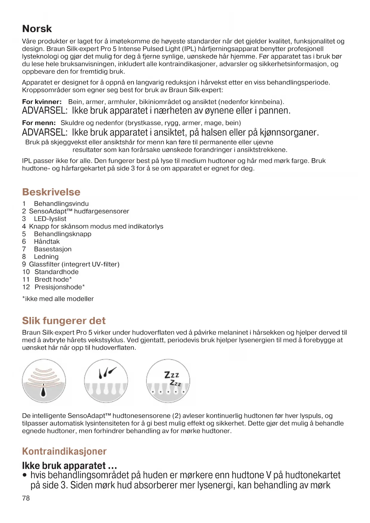skjegg/ansiktshår for menn. Det anbefales ikke å bruke dette apparatet på områder hvor det finnes dermale fyllstoffer. Må ikke brukes mer enn én gang i uken på samme område. Det kan oppstå skade i huden etter langvarig eller gjentakende behandling på ett sted. 91840600_Victoria2_PL5_Euro1.indd 7991840600_Victoria2_PL5_Euro1.indd 79 13.01.21 10:0413.01.21 10:0480 Sikkerhet for øynene Ikke se direkte inn i glassfilteret (9) eller forsøk å slå på apparatet hvis det er rettet mot øynene. For å beskytte dine egne og andres øyne, aktiveres apparatet kun når begge hudtonesensorene berører huden. Dersom apparatet på noe tidspunkt aktiveres UTEN AT begge sensorene er i kontakt med huden, må du straks AVBRYTE bruken av apparatet og kontakte forhandleren. Hvis instruksjonene ikke følges, kan det føre til skader på øynene (som potensielt kan føre til synstap) eller skader på huden. Beskytt øynene mot eksponering. Ikke bruk apparatet over øyelokkene eller nært øynene. Forholdsregler