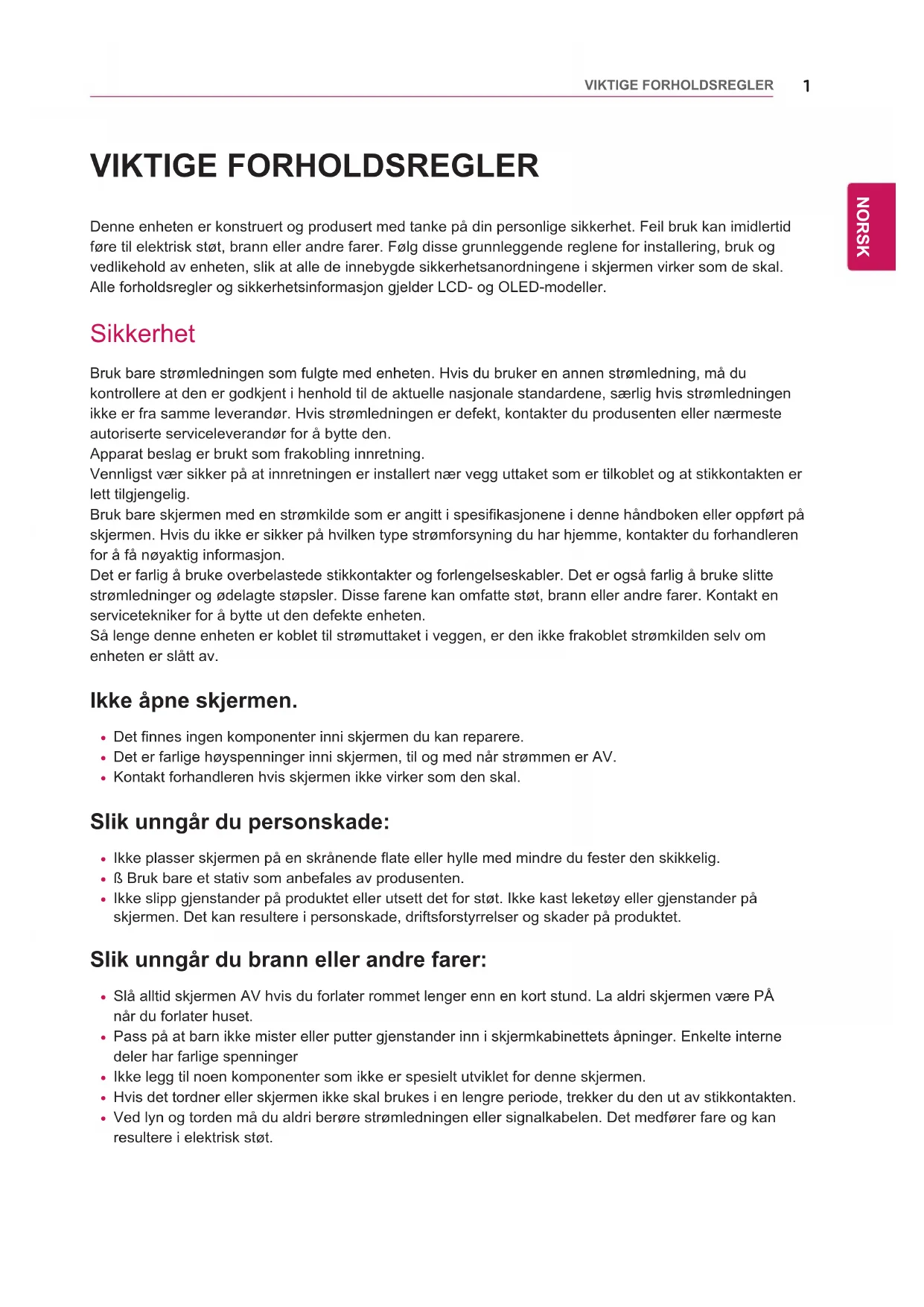 ÁGUA WaterCHemiCaliËn1 ENG NORSKVIKTIGE FORHOLDSREGLER VIKTIGE FORHOLDSREGLER Denne enheten er konstruert og produsert med tanke på din personlige sikkerhet. Feil bruk kan imidlertid føre til elektrisk støt, brann eller andre farer. Følg disse grunnleggende reglene for installering, bruk og vedlikehold av enheten, slik at alle de innebygde sikkerhetsanordningene i skjermen virker som de skal.Alle forholdsregler og sikkerhetsinformasjon gjelder LCD- og OLED-modeller. Sikkerhet Bruk bare strømledningen som fulgte med enheten. Hvis du bruker en annen strømledning, må du kontrollere at den er godkjent i henhold til de aktuelle nasjonale standardene, særlig hvis strømledningen ikke er fra samme leverandør. Hvis strømledningen er defekt, kontakter du produsenten eller nærmesteautoriserte serviceleverandør for å bytte den.Apparat beslag er brukt som frakobling innretning.Vennligst vær sikker på at innretningen er installert nær vegg uttaket som er tilkoblet og at stikkontakten er lett tilgjengelig.Bruk bare skjermen med en strømkilde som er angitt i spesifikasjonene i denne håndboken eller oppført på skjermen. Hvis du ikke er sikker på hvilken type strømforsyning du har hjemme, kontakter du forhandleren for å få nøyaktig informasjon.Det er farlig å bruke overbelastede stikkontakter og forlengelseskabler. Det er også farlig å bruke slitte strømledninger og ødelagte støpsler. Disse farene kan omfatte støt, brann eller andre farer. Kontakt en servicetekniker for å bytte ut den defekte enheten.Så lenge denne enheten er koblet til strømuttaket i veggen, er den ikke frakoblet strømkilden selv om enheten er slått av. Ikke åpne skjermen.