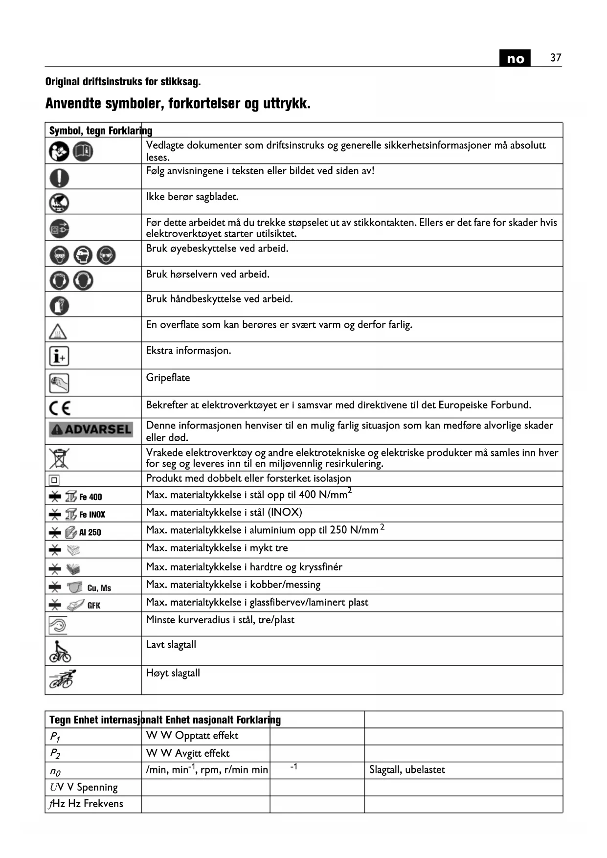 Ikke bruk dette elektroverktoyet for du har lest og forstatt donne driftsinstruksen og de vedlagte "Generelle sikkerhetsinformasjonene" (doku