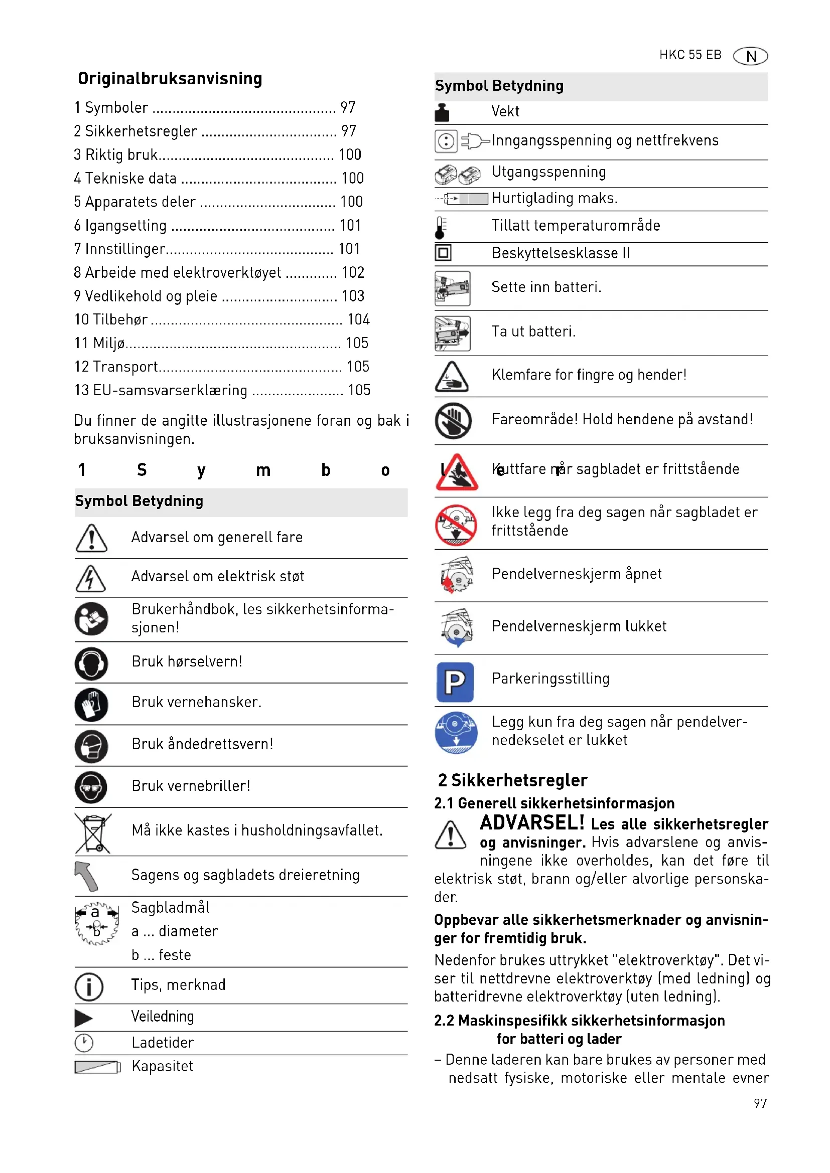 Vekt Inngangsspenning og nettfrekvens Utgangsspenning Hurtiglading maks. Tillatt temperaturområde Beskyttelsesklasse II Sette inn batteri. Ta ut batteri. Klemfare for fingre og hender! Fareområde! Hold hendene på avstand! Kuttfare når sagbladet er frittstående Ikke legg fra deg sagen når sagbladet er frittstående Pendelverneskjerm åpnet Pendelverneskjerm lukket Parkeringsstilling Legg kun fra deg sagen når pendelver- nedekselet er lukket Symbol Betydning www.festool.com