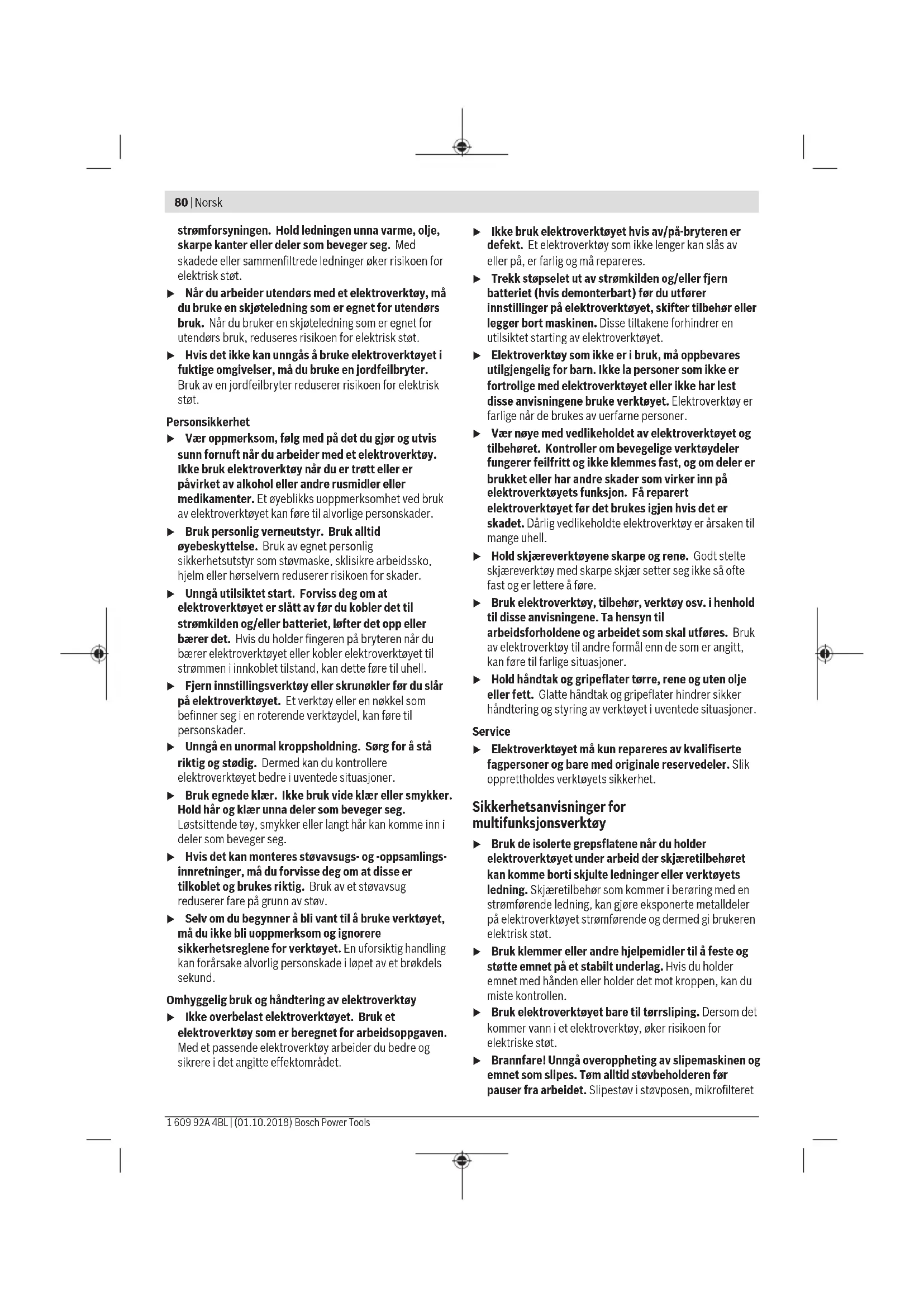 o/min 15000–20000 Oscillasjonsvinkel venstre/ høyre ° 1,4 Vekt i samsvar med EPTA-Procedure 01:2014 kg 1,1 Kapslingsgrad / II Angivelsene gjelder for merkespenning [U] på 230 V. Ved avvikende spenning og på utførelser for bestemte land kan disse angivelsene variere. Norsk | 81 Bosch Power Tools 1 609 92A 4BL | (01.10.2018)82 | Norsk 1 609 92A 4BL | (01.10.2018) Bosch Power Tools Støy-/vibrasjonsinformasjon Støyemisjon målt i henhold til EN62841‑2‑4. Vanlig A-støynivå for elektroverktøyet: 84 dB(A); lydeffektnivå 95 dB(A). Usikkerhet K=3 dB. Bruk hørselsvern! Arbeid uten ekstrahåndtak Vibrasjonsverdi totalt a
