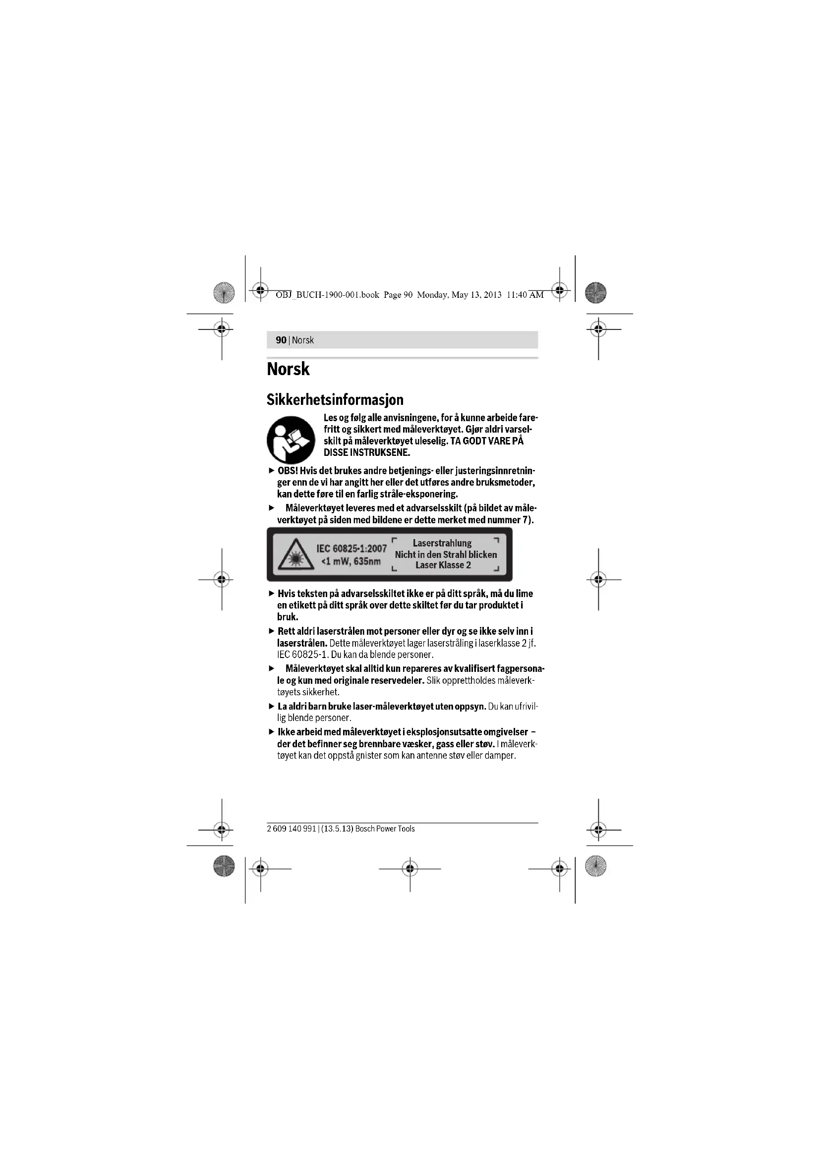 Minste indikatorenhet 1mm OBJ_BUCH-1900-001.book Page 91 Monday, May 13, 2013 11:40 AM92 | Norsk 2 609 140 991 | (13.5.13) Bosch Power Tools Montering Innsetting/utskifting av batterier Til drift av måleverktøyet anbefales det å bruke alkali-mangan-batterier. Åpne dekselet til batterirommet 4 ved å trykke låsen 5 i pilretningen og ta av dekselet. Sett inn batteriene. Pass på riktig polaritet, som vist på innsi- den av batterirommet. Måletid –Vanlig – Maks. 0,5 s 4 s Driftstemperatur – 10 °C ... +40 °C Lagertemperatur – 20 °C ... +70 °C Relativ luftfuktighet max. 90 % Laserklasse