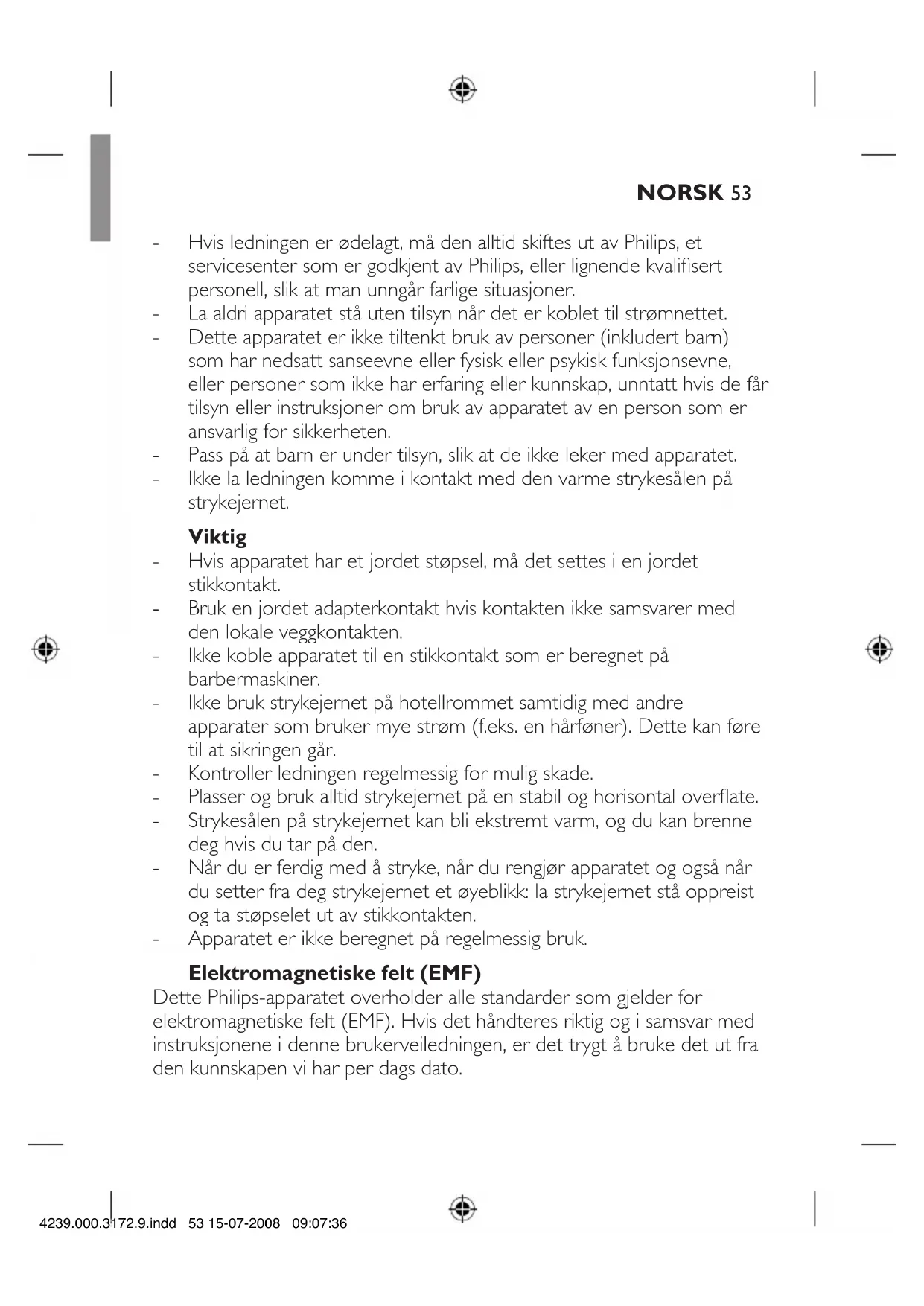 NORSK 4239.000.3172.9.indd 52 15-07-2008 09:07:36Hvis ledningen er ødelagt, må den alltid skiftes ut av Philips, et servicesenter som er godkjent av Philips, eller lignende kvalisert personell, slik at man unngår farlige situasjoner. La aldri apparatet stå uten tilsyn når det er koblet til strømnettet. Dette apparatet er ikke tiltenkt bruk av personer (inkludert barn) som har nedsatt sanseevne eller fysisk eller psykisk funksjonsevne, eller personer som ikke har erfaring eller kunnskap, unntatt hvis de får tilsyn eller instruksjoner om bruk av apparatet av en person som er ansvarlig for sikkerheten. Pass på at barn er under tilsyn, slik at de ikke leker med apparatet. Ikke la ledningen komme i kontakt med den varme strykesålen på strykejernet. Viktig Hvis apparatet har et jordet støpsel, må det settes i en jordet stikkontakt. Bruk en jordet adapterkontakt hvis kontakten ikke samsvarer med den lokale veggkontakten. Ikke koble apparatet til en stikkontakt som er beregnet på barbermaskiner. Ikke bruk strykejernet på hotellrommet samtidig med andre apparater som bruker mye strøm (f.eks. en hårføner). Dette kan føre til at sikringen går. Kontroller ledningen regelmessig for mulig skade. Plasser og bruk alltid strykejernet på en stabil og horisontal overate. Strykesålen på strykejernet kan bli ekstremt varm, og du kan brenne deg hvis du tar på den. Når du er ferdig med å stryke, når du rengjør apparatet og også når du setter fra deg strykejernet et øyeblikk: la strykejernet stå oppreist og ta støpselet ut av stikkontakten. Apparatet er ikke beregnet på regelmessig bruk. Elektromagnetiske felt (EMF) Dette Philips-apparatet overholder alle standarder som gjelder for elektromagnetiske felt (EMF). Hvis det håndteres riktig og i samsvar med instruksjonene i denne brukerveiledningen, er det trygt å bruke det ut fra den kunnskapen vi har per dags dato.