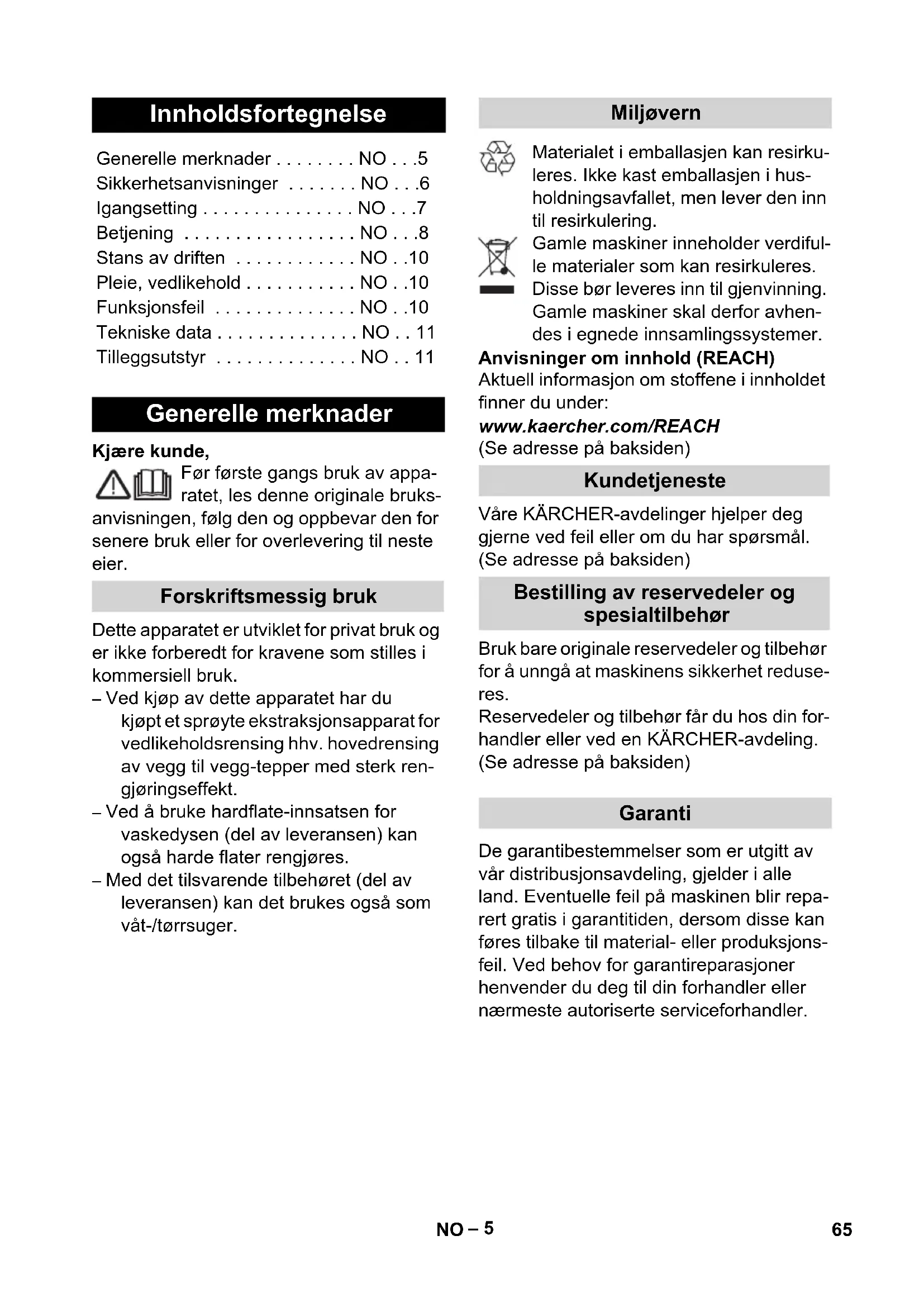 • Netsikring (træg) 10 A Beholdervolumen 18 l Vandoptagelse, max. 4 l Ydelse P nom. 1200 W Ydelse P maks. 1400 W Netkabel H05-VV-F2x0,75 Lydtryksniveau (EN 60704-2-1) 74 dB(A) Ekstratilbehør Bestillingsnr. Filterpose (5 stk.) 6.959-130.0 Patronfilter 6.414-552.0 Sprøjte-ex-hånddyse til rengøring af polstre 2.885-018.0 Tæpperensemiddel RM 519 (1 l dunk) International 6.295-771.0 Tekstilimprægnering Care Tex RM 762 (0,5 l dunk) International 6.295-769.0 64 DA– 5 Kjære kunde, Før første gangs bruk av appa- ratet, les denne originale bruks- anvisningen, følg den og oppbevar den for senere bruk eller for overlevering til neste eier. Dette apparatet er utviklet for privat bruk og er ikke forberedt for kravene som stilles i kommersiell bruk. – Ved kjøp av dette apparatet har du kjøpt et sprøyte ekstraksjonsapparat for vedlikeholdsrensing hhv. hovedrensing av vegg til vegg-tepper med sterk ren- gjøringseffekt. – Ved å bruke hardflate-innsatsen for vaskedysen (del av leveransen) kan også harde flater rengjøres. – Med det tilsvarende tilbehøret (del av leveransen) kan det brukes også som våt-/tørrsuger. Materialet i emballasjen kan resirku- leres. Ikke kast emballasjen i hus- holdningsavfallet, men lever den inn til resirkulering. Gamle maskiner inneholder verdiful- le materialer som kan resirkuleres. Disse bør leveres inn til gjenvinning. Gamle maskiner skal derfor avhen- des i egnede innsamlingssystemer. Anvisninger om innhold (REACH) Aktuell informasjon om stoffene i innholdet finner du under: www.kaercher.com/REACH (Se adresse på baksiden) Våre KÄRCHER-avdelinger hjelper deg gjerne ved feil eller om du har spørsmål. (Se adresse på baksiden) Bruk bare originale reservedeler og tilbehør for å unngå at maskinens sikkerhet reduse- res. Reservedeler og tilbehør får du hos din for- handler eller ved en KÄRCHER-avdeling. (Se adresse på baksiden) De garantibestemmelser som er utgitt av vår distribusjonsavdeling, gjelder i alle land. Eventuelle feil på maskinen blir repa- rert gratis i garantitiden, dersom disse kan føres tilbake til material- eller produksjons- feil. Ved behov for garantireparasjoner henvender du deg til din forhandler eller nærmeste autoriserte serviceforhandler. Innholdsfortegnelse Generelle merknader