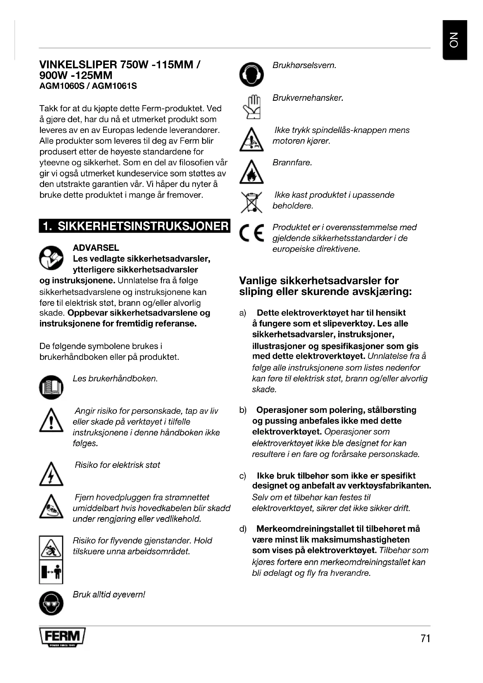ADVARSEL Les vedlagte sikkerhetsadvarsler, ytterligere sikkerhetsadvarsler og instruksjonene. Unnlatelse fra å følge sikkerhetsadvarslene og instruksjonene kan føre til elektrisk støt, brann og/eller alvorlig skade. Oppbevar sikkerhetsadvarslene og instruksjonene for fremtidig referanse. De følgende symbolene brukes i brukerhåndboken eller på produktet. Les brukerhåndboken. Angir risiko for personskade, tap av liv eller skade på verktøyet i tilfelle instruksjonene i denne håndboken ikke følges. Risiko for elektrisk støt Fjern hovedpluggen fra strømnettet umiddelbart hvis hovedkabelen blir skadd under rengjøring eller vedlikehold. Risiko for flyvende gjenstander. Hold tilskuere unna arbeidsområdet. Bruk alltid øyevern! Bruk hørselsvern. Bruk vernehansker. Ikke trykk spindellås-knappen mens motoren kjører. Brannfare. Ikke kast produktet i upassende beholdere. Produktet er i overensstemmelse med gjeldende sikkerhetsstandarder i de europeiske direktivene. Vanlige sikkerhetsadvarsler for sliping eller skurende avskjæring: a) Dette elektroverktøyet har til hensikt å fungere som et slipeverktøy. Les alle sikkerhetsadvarsler, instruksjoner, illustrasjoner og spesikasjoner som gis med dette elektroverktøyet. Unnlatelse fra å følge alle instruksjonene som listes nedenfor kan føre til elektrisk støt, brann og/eller alvorlig skade. b) Operasjoner som polering, stålbørsting og pussing anbefales ikke med dette elektroverktøyet. Operasjoner som elektroverktøyet ikke ble designet for kan resultere i en fare og forårsake personskade. c) Ikke bruk tilbehør som ikke er spesikt designet og anbefalt av verktøysfabrikanten. Selv om et tilbehør kan festes til elektroverktøyet, sikrer det ikke sikker drift. d) Merkeomdreiningstallet til tilbehøret må være minst lik maksimumshastigheten som vises på elektroverktøyet. Tilbehør som kjøres fortere enn merkeomdreiningstallet kan bli ødelagt og y fra hverandre.72