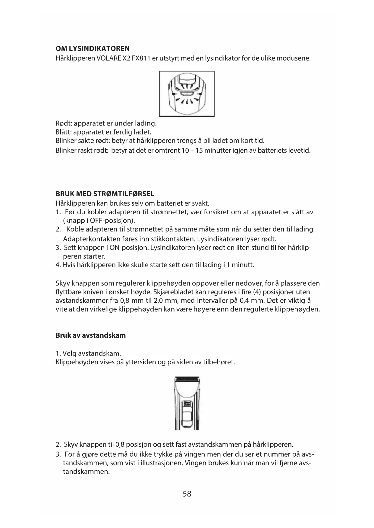- Viktig: for å forlenge batteriets levetid anbefales det å vente med å lade hårklippe- ren til lysindikatoren blinker rødt.58 OM LYSINDIKATOREN Hårklipperen VOLARE X2 FX811 er utstyrt med en lysindikator for de ulike modusene. Rødt: apparatet er under lading. Blått: apparatet er ferdig ladet. Blinker sakte rødt: betyr at hårklipperen trengs å bli ladet om kort tid. Blinker raskt rødt: betyr at det er omtrent 10 – 15 minutter igjen av batteriets levetid.