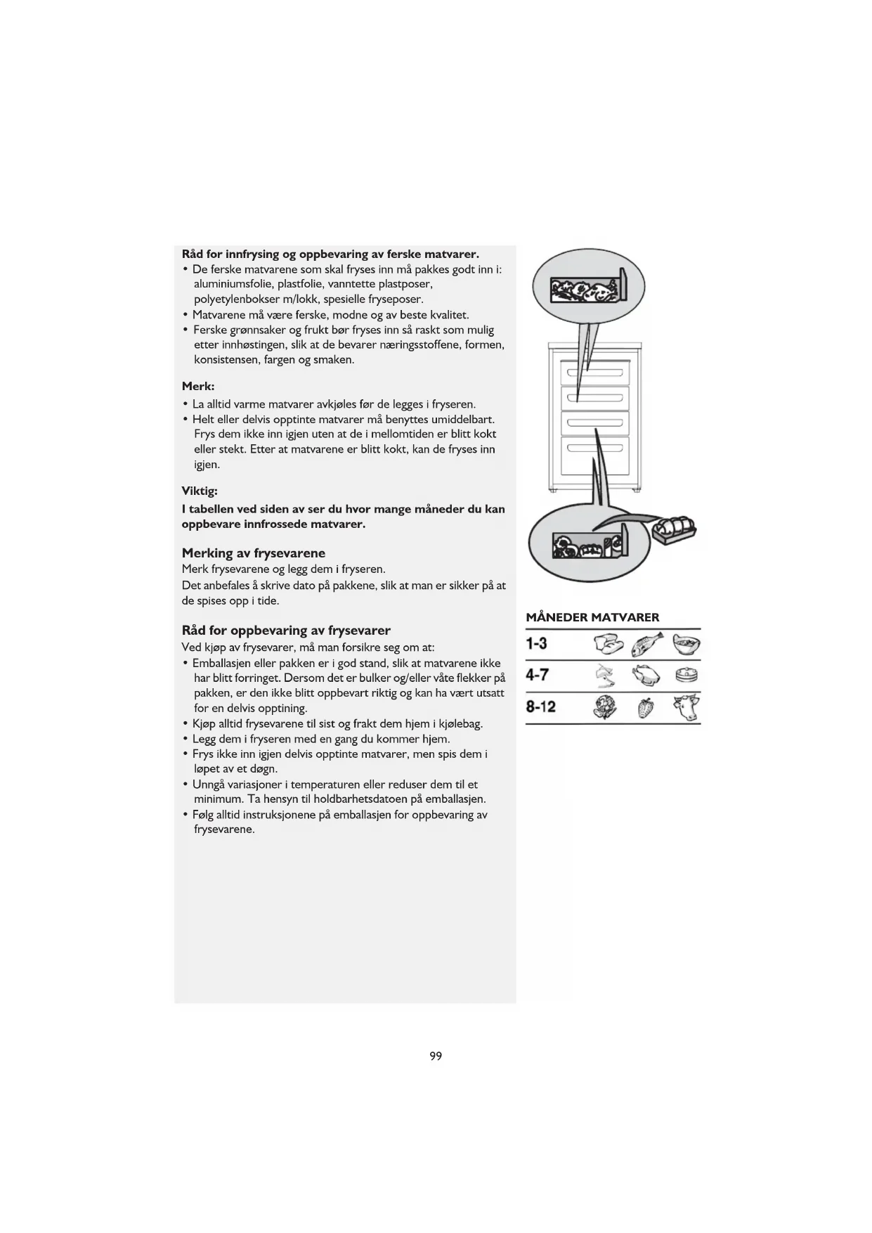 - Følg alltid instruksjonene på emballasjen for oppbevaring av frysevarene.