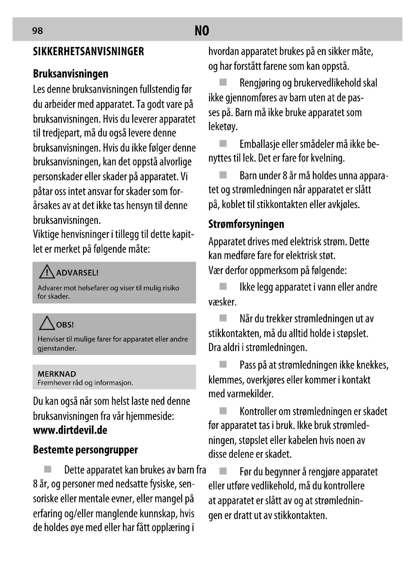 97SIKKERHETSANVISNINGER Bruksanvisningen Les denne bruksanvisningen fullstendig før du arbeider med apparatet. Ta godt vare på bruksanvisningen. Hvis du leverer apparatet til tredjepart, må du også levere denne bruksanvisningen. Hvis du ikke følger denne bruksanvisningen, kan det oppstå alvorlige personskader eller skader på apparatet. Vi påtar oss intet ansvar for skader som for- årsakes av at det ikke tas hensyn til denne bruksanvisningen. Viktige henvisninger i tillegg til dette kapit- let er merket på følgende måte: ADVARSEL! Advarer mot helsefarer og viser til mulig risiko for skader. OBS! Henviser til mulige farer for apparatet eller andre gjenstander. MERKNAD Fremhever råd og informasjon. Du kan også når som helst laste ned denne bruksanvisningen fra vår hjemmeside: www.dirtdevil.de Bestemte persongrupper Dette apparatet kan brukes av barn fra 8 år, og personer med nedsatte fysiske, sen- soriske eller mentale evner, eller mangel på erfaring og/eller manglende kunnskap, hvis de holdes øye med eller har fått opplæring i hvordan apparatet brukes på en sikker måte, og har forstått farene som kan oppstå. Rengjøring og brukervedlikehold skal ikke gjennomføres av barn uten at de pas- ses på. Barn må ikke bruke apparatet som leketøy. Emballasje eller smådeler må ikke be- nyttes til lek. Det er fare for kvelning. Barn under 8 år må holdes unna appara- tet og strømledningen når apparatet er slått på, koblet til stikkontakten eller avkjøles. Strømforsyningen Apparatet drives med elektrisk strøm. Dette kan medføre fare for elektrisk støt. Vær derfor oppmerksom på følgende: Ikke legg apparatet i vann eller andre væsker. Når du trekker strømledningen ut av stikkontakten, må du alltid holde i støpslet. Dra aldri i strømledningen. Pass på at strømledningen ikke knekkes, klemmes, overkjøres eller kommer i kontakt med varmekilder. Kontroller om strømledningen er skadet før apparatet tas i bruk. Ikke bruk strømled- ningen, støpslet eller kabelen hvis noen av disse delene er skadet. Før du begynner å rengjøre apparatet eller utføre vedlikehold, må du kontrollere at apparatet er slått av og at strømlednin- gen er dratt ut av stikkontakten.