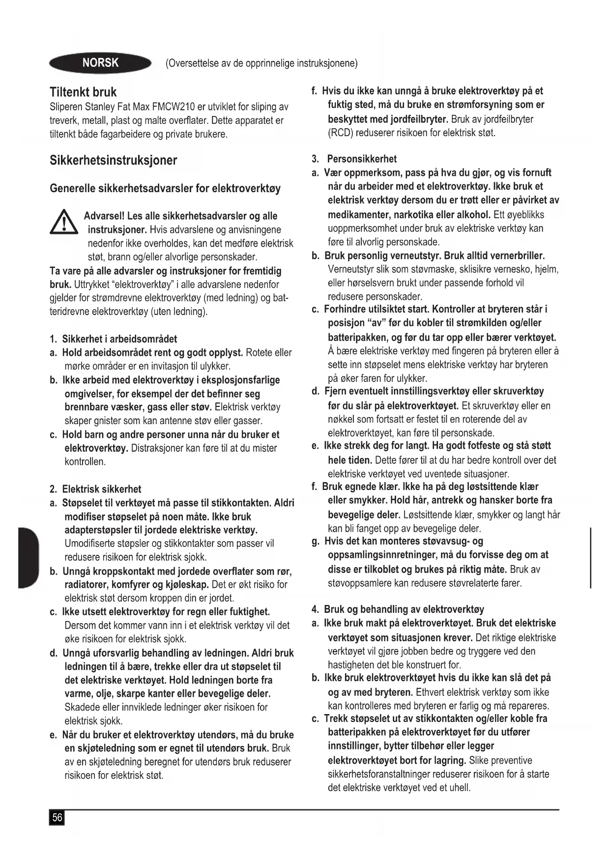 Advarsel! Les alle sikkerhetsadvarsler og alle instruksjoner. Hvis advarslene og anvisningene nedenfor ikke overholdes, kan det medføre elektrisk støt, brann og/eller alvorlige personskader. Ta vare på alle advarsler og instruksjoner for fremtidig bruk. Uttrykket “elektroverktøy” i alle advarslene nedenfor gjelder for strømdrevne elektroverktøy (med ledning) og bat- teridrevne elektroverktøy (uten ledning).