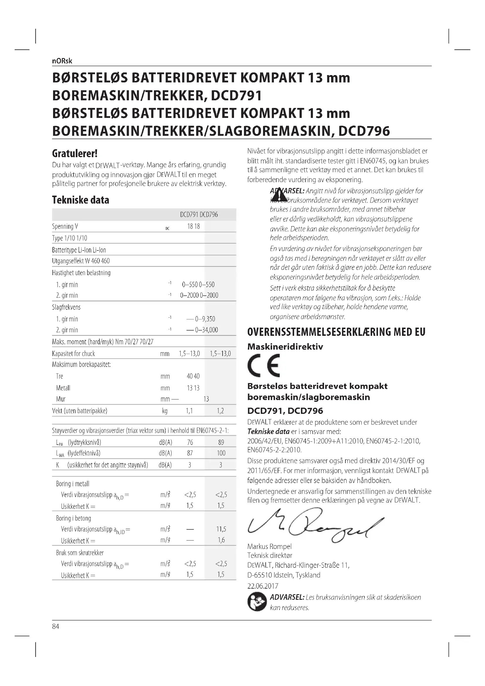 Undertegnede er ansvarlig for sammenstillingen av den tekniske filen og fremsetter denne erklæringen på vegne av DEWALT.