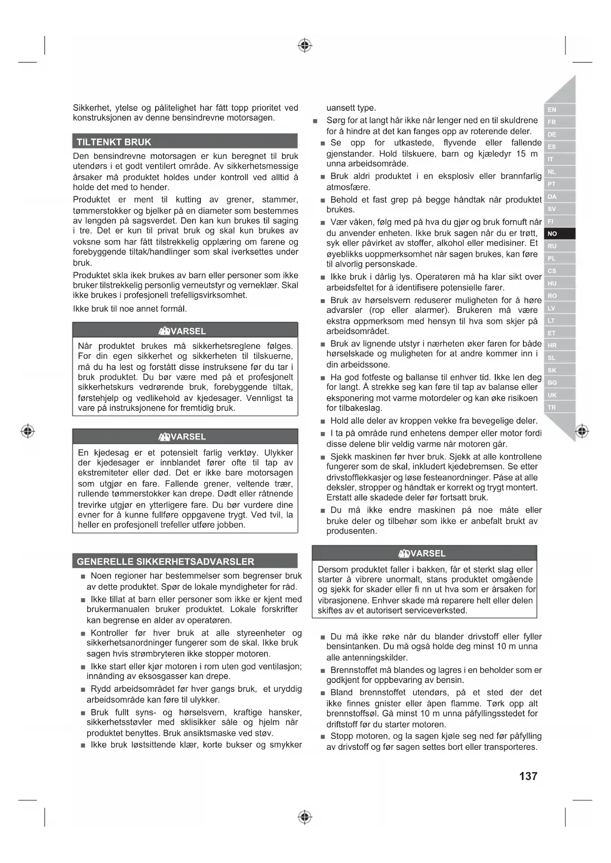Sikkerhet, ytelse og pålitelighet har fått topp prioritet ved konstruksjonen av denne bensindrevne motorsagen. TILTENKT BRUK Den bensindrevne motorsagen er kun beregnet til bruk utendørs i et godt ventilert område. Av sikkerhetsmessige årsaker må produktet holdes under kontroll ved alltid å holde det med to hender. Produktet er ment til kutting av grener, stammer, tømmerstokker og bjelker på en diameter som bestemmes av lengden på sagsverdet. Den kan kun brukes til saging i tre. Det er kun til privat bruk og skal kun brukes av voksne som har fått tilstrekkelig opplæring om farene og forebyggende tiltak/handlinger som skal iverksettes under bruk. Produktet skla ikek brukes av barn eller personer som ikke bruker tilstrekkelig personlig verneutstyr og verneklær. Skal ikke brukes i profesjonell trefelligsvirksomhet. Ikke bruk til noe annet formål. ADVARSEL Når produktet brukes må sikkerhetsreglene følges. For din egen sikkerhet og sikkerheten til tilskuerne, må du ha lest og forstått disse instruksene før du tar i bruk produktet. Du bør være med på et profesjonelt sikkerhetskurs vedrørende bruk, forebyggende tiltak, førstehjelp og vedlikehold av kjedesager. Vennligst ta vare på instruksjonene for fremtidig bruk. ADVARSEL En kjedesag er et potensielt farlig verktøy. Ulykker der kjedesager er innblandet fører ofte til tap av ekstremiteter eller død. Det er ikke bare motorsagen som utgjør en fare. Fallende grener, veltende trær, rullende tømmerstokker kan drepe. Dødt eller råtnende trevirke utgjør en ytterligere fare. Du bør vurdere dine evner for å kunne fullføre oppgavene trygt. Ved tvil, la heller en profesjonell trefeller utføre jobben. GENERELLE SIKKERHETSADVARSLER ■ Noen regioner har bestemmelser som begrenser bruk av dette produktet. Spør de lokale myndigheter for råd. ■ Ikke tillat at barn eller personer som ikke er kjent med brukermanualen bruker produktet. Lokale forskrifter kan begrense en alder av operatøren. ■ Kontroller før hver bruk at alle styreenheter og sikkerhetsanordninger fungerer som de skal. Ikke bruk sagen hvis strømbryteren ikke stopper motoren. ■ Ikke start eller kjør motoren i rom uten god ventilasjon; innånding av eksosgasser kan drepe. ■ Rydd arbeidsområdet før hver gangs bruk, et uryddig arbeidsområde kan føre til ulykker. ■ Bruk fullt syns- og hørselsvern, kraftige hansker, sikkerhetsstøvler med sklisikker såle og hjelm når produktet benyttes. Bruk ansiktsmaske ved støv. ■ Ikke bruk løstsittende klær, korte bukser og smykker uansett type. ■ Sørg for at langt hår ikke når lenger ned en til skuldrene for å hindre at det kan fanges opp av roterende deler. ■ Se opp for utkastede, flyvende eller fallende gjenstander. Hold tilskuere, barn og kjæledyr 15 m unna arbeidsområde. ■ Bruk aldri produktet i en eksplosiv eller brannfarlig atmosfære. ■ Behold et fast grep på begge håndtak når produktet brukes. ■ Vær våken, følg med på hva du gjør og bruk fornuft når du anvender enheten. Ikke bruk sagen når du er trøtt, syk eller påvirket av stoffer, alkohol eller medisiner. Et øyeblikks uoppmerksomhet når sagen brukes, kan føre til alvorlig personskade. ■ Ikke bruk i dårlig lys. Operatøren må ha klar sikt over arbeidsfeltet for å identifisere potensielle farer. ■ Bruk av hørselsvern reduserer muligheten for å høre advarsler (rop eller alarmer). Brukeren må være ekstra oppmerksom med hensyn til hva som skjer på arbeidsområdet. ■ Bruk av lignende utstyr i nærheten øker faren for både hørselskade og muligheten for at andre kommer inn i din arbeidssone. ■ Ha god fotfeste og ballanse til enhver tid. Ikke len deg for langt. Å strekke seg kan føre til tap av balanse eller eksponering mot varme motordeler og kan øke risikoen for tilbakeslag. ■ Hold alle deler av kroppen vekke fra bevegelige deler. ■ I ta på område rund enhetens demper eller motor fordi disse delene blir veldig varme når motoren går. ■ Sjekk maskinen før hver bruk. Sjekk at alle kontrollene fungerer som de skal, inkludert kjedebremsen. Se etter drivstofflekkasjer og løse festeanordninger. Påse at alle deksler, stropper og håndtak er korrekt og trygt montert. Erstatt alle skadede deler før fortsatt bruk. ■ Du må ikke endre maskinen på noe måte eller bruke deler og tilbehør som ikke er anbefalt brukt av produsenten. ADVARSEL Dersom produktet faller i bakken, får et sterkt slag eller starter å vibrere unormalt, stans produktet omgående og sjekk for skader eller fi nn ut hva som er årsaken for vibrasjonene. Enhver skade må reparere helt eller delen skiftes av et autorisert serviceverksted. ■ Du må ikke røke når du blander drivstoff eller fyller bensintanken. Du må også holde deg minst 10 m unna alle antenningskilder. ■ Brennstoffet må blandes og lagres i en beholder som er godkjent for oppbevaring av bensin. ■ Bland brennstoffet utendørs, på et sted der det ikke finnes gnister eller åpen flamme. Tørk opp alt brennstoffsøl. Gå minst 10 m unna påfyllingsstedet for driftstoff før du starter motoren. ■ Stopp motoren, og la sagen kjøle seg ned før påfylling av drivstoff og før sagen settes bort eller transporteres.138 | Norsk ■ Husk forsvarlig lukking av alle tanklokk etter etterfylling av drivstoff eller olje. KJEDESAG SIKKERHETSADVARSLER ■ Monter alltid sverddekslet når produktet ikke er i bruk eller blir båret eller transportert. Dette vil bidra til å redusere utilsiktet kontakt med de skarpe knivene i sagkjeden. Bær produktet i det øvre håndtaket med sverdet pekende vekk fra kroppen. ■ Pass på å bli vant til sagen før du begynner å sage, og sag bare i trevirke som er sikkert understøttet. Dette må du alltid gjøre hvis produktet ikke har vært brukt på en stund. ■ Kapp tømmerstokker i en sagkrakk eller vugge når produktet brukes for første gang. ■ Påse at alle verneanordninger, håndtak og piggvernet er påsatt riktig og i