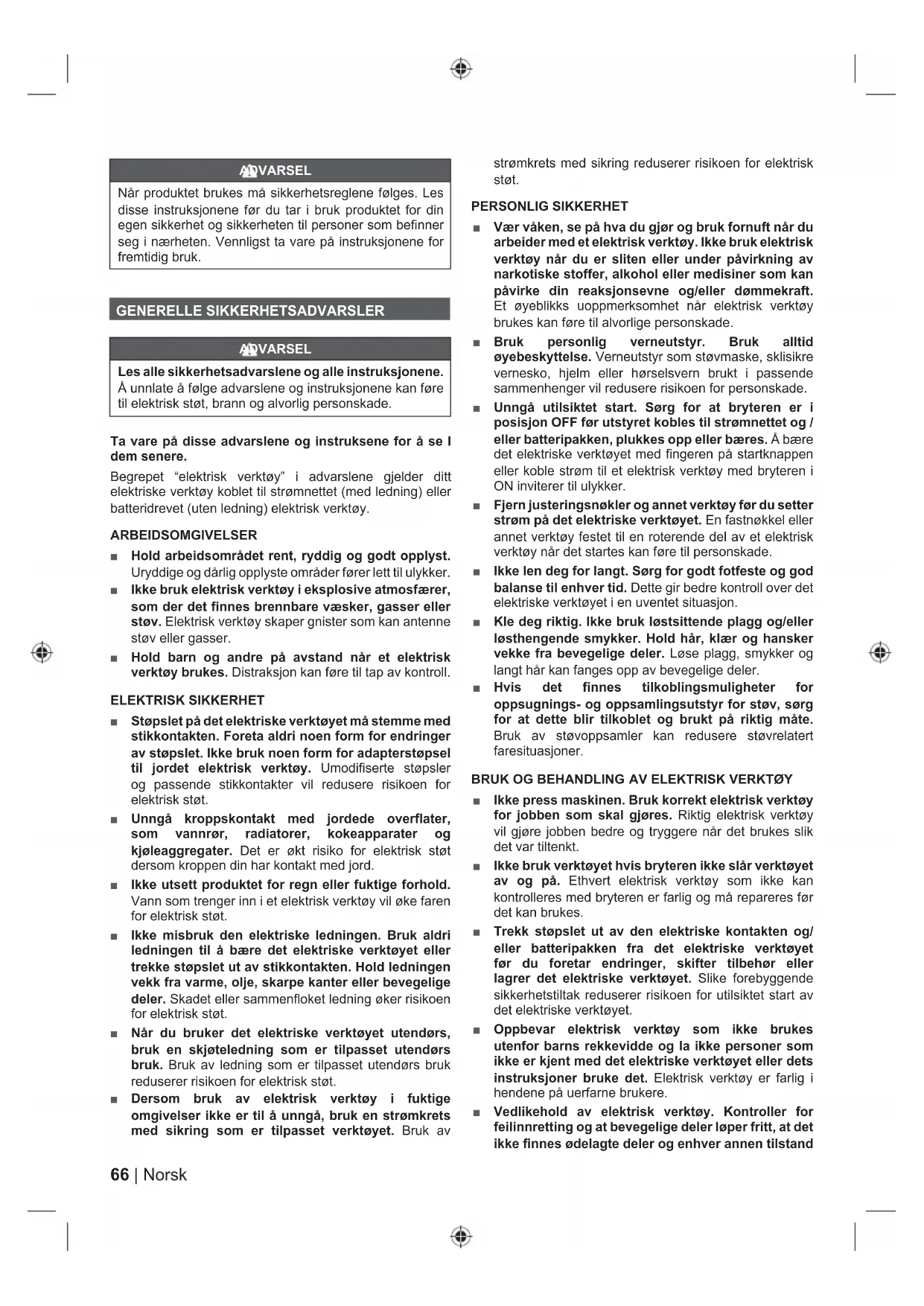 Ŷ Ikke press maskinen. Bruk korrekt elektrisk verktøy for jobben som skal gjøres. Riktig elektrisk verktøy vil gjøre jobben bedre og tryggere når det brukes slik det var tiltenkt. Ŷ Ikke bruk verktøyet hvis bryteren ikke slår verktøyet av og på. Ethvert elektrisk verktøy som ikke kan kontrolleres med bryteren er farlig og må repareres før det kan brukes. Ŷ Trekk støpslet ut av den elektriske kontakten og/ eller batteripakken fra det elektriske verktøyet før du foretar endringer, skifter tilbehør eller lagrer det elektriske verktøyet. Slike forebyggende sikkerhetstiltak reduserer risikoen for utilsiktet start av det elektriske verktøyet. Ŷ Oppbevar elektrisk verktøy som ikke brukes utenfor barns rekkevidde og la ikke personer som ikke er kjent med det elektriske verktøyet eller dets instruksjoner bruke det. Elektrisk verktøy er farlig i hendene på uerfarne brukere. Ŷ Vedlikehold av elektrisk verktøy. Kontroller for feilinnretting og at bevegelige deler løper fritt, at det ikke finnes ødelagte deler og enhver annen tilstand67 Norsk |