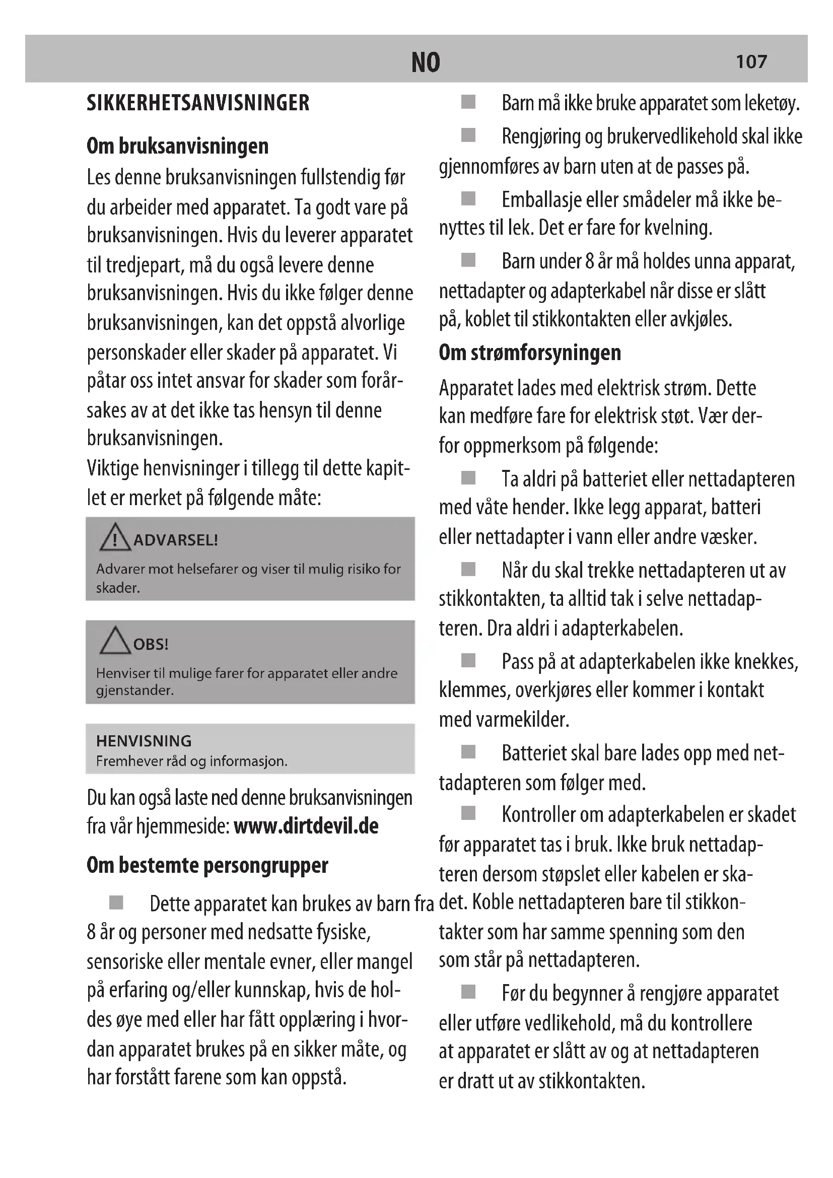 NOSIKKERHETSANVISNINGER Om bruksanvisningen Les denne bruksanvisningen fullstendig før du arbeider med apparatet. Ta godt vare på bruksanvisningen. Hvis du leverer apparatet til tredjepart, må du også levere denne bruksanvisningen. Hvis du ikke følger denne bruksanvisningen, kan det oppstå alvorlige personskader eller skader på apparatet. Vi påtar oss intet ansvar for skader som forår- sakes av at det ikke tas hensyn til denne bruksanvisningen. Viktige henvisninger i tillegg til dette kapit- let er merket på følgende måte: ADVARSEL! Advarer mot helsefarer og viser til mulig risiko for skader. OBS! Henviser til mulige farer for apparatet eller andre gjenstander. HENVISNING Fremhever råd og informasjon. Du kan også laste ned denne bruksanvisningen fra vår hjemmeside: www.dirtdevil.de Om bestemte persongrupper Dette apparatet kan brukes av barn fra 8år og personer med nedsatte fysiske, sensoriske eller mentale evner, eller mangel på erfaring og/eller kunnskap, hvis de hol- des øye med eller har fått opplæring i hvor- dan apparatet brukes på en sikker måte, og har forstått farene som kan oppstå. Barn må ikke bruke apparatet som leketøy. Rengjøring og brukervedlikehold skal ikke gjennomføres av barn uten at de passes på. Emballasje eller smådeler må ikke be- nyttes til lek. Det er fare for kvelning. Barn under 8 år må holdes unna apparat, nettadapter og adapterkabel når disse er slått på, koblet til stikkontakten eller avkjøles. Om strømforsyningen Apparatet lades med elektrisk strøm. Dette kan medføre fare for elektrisk støt. Vær der- for oppmerksom på følgende: Ta aldri på batteriet eller nettadapteren med våte hender. Ikke legg apparat, batteri eller nettadapter i vann eller andre væsker. Når du skal trekke nettadapteren ut av stikkontakten, ta alltid tak i selve nettadap- teren. Dra aldri i adapterkabelen. Pass på at adapterkabelen ikke knekkes, klemmes, overkjøres eller kommer i kontakt med varmekilder. Batteriet skal bare lades opp med net- tadapteren som følger med. Kontroller om adapterkabelen er skadet før apparatet tas i bruk. Ikke bruk nettadap- teren dersom støpslet eller kabelen er ska- det. Koble nettadapteren bare til stikkon- takter som har samme spenning som den som står på nettadapteren. Før du begynner å rengjøre apparatet eller utføre vedlikehold, må du kontrollere at apparatet er slått av og at nettadapteren er dratt ut av stikkontakten.