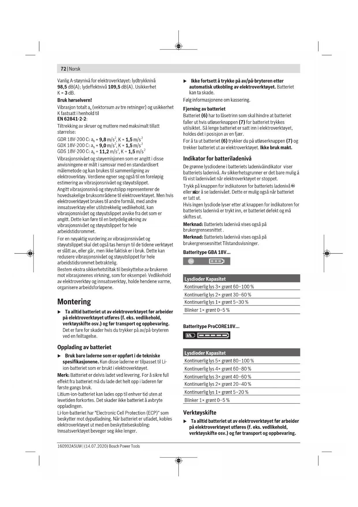 Vibrasjonsnivået og støyemisjonen som er angitt i disse anvisningene er målt i samsvar med en standardisert målemetode og kan brukes til sammenligning av elektroverktøy. Verdiene egner seg også til en foreløpig estimering av vibrasjonsnivået og støyutslippet. Angitt vibrasjonsnivå og støyutslipp representerer de hovedsakelige bruksområdene til elektroverktøyet. Men hvis elektroverktøyet brukes til andre formål, med andre innsatsverktøy eller utilstrekkelig vedlikehold, kan vibrasjonsnivået og støyutslippet avvike fra det som er angitt. Dette kan føre til en betydelig økning av vibrasjonsnivået og støyutslippet for hele arbeidstidsrommet. For en nøyaktig vurdering av vibrasjonsnivået og støyutslippet skal det også tas hensyn til de tidene verktøyet er slått av, eller går, men ikke faktisk er i bruk. Dette kan redusere vibrasjonsnivået og støyutslippet for hele arbeidstidsrommet betraktelig. Bestem ekstra sikkerhetstiltak til beskyttelse av brukeren mot vibrasjonenes virkning, som for eksempel: Vedlikehold av elektroverktøy og innsatsverktøy, holde hendene varme, organisere arbeidsforløpene. Montering u Ta alltid batteriet ut av elektroverktøyet før arbeider på elektroverktøyet utføres (f.eks. vedlikehold, verktøyskifte osv.) og før transport og oppbevaring. Det er fare for skader hvis du trykker på av/på-bryteren ved en feiltagelse. Opplading av batteriet u Bruk bare laderne som er oppført i de tekniske spesifikasjonene. Kun disse laderne er tilpasset til Li- ion-batteriet som er brukt i elektroverktøyet. Merk: Batteriet er delvis ladet ved levering. For å sikre full effekt fra batteriet må du lade det helt opp i laderen før første gangs bruk. Litium-ion-batteriet kan lades opp til enhver tid uten at levetiden forkortes. Det skader ikke batteriet å avbryte oppladingen. Li-Ion-batteriet har "Electronic Cell Protection (ECP)" som beskytter mot dyputladning. Når batteriet er utladet, kobles elektroverktøyet ut med en beskyttelseskobling: Innsatsverktøyet beveger seg ikke lenger. u Ikke fortsett å trykke på av/på-bryteren etter automatisk utkobling av elektroverktøyet. Batteriet kan ta skade. Følg informasjonene om kassering. Fjerning av batteriet Batteriet (6) har to låsetrinn som skal hindre at batteriet faller ut hvis utløserknappen (7) for batteriet trykkes utilsiktet. Så lenge batteriet er satt inn i elektroverktøyet, holdes det i posisjon av en fjær. For å ta ut batteriet (6) trykker du på utløserknappen (7) og trekker batteriet ut av elektroverktøyet. Ikke bruk makt. Indikator for batteriladenivå De grønne lysdiodene i batteriets ladenivåindikator viser batteriets ladenivå. Av sikkerhetsgrunner er det bare mulig å få vist ladenivået når elektroverktøyet er stoppet. Trykk på knappen for indikatoren for batteriets ladenivå eller for å se ladenivået. Dette er mulig også når batteriet er tatt ut. Hvis ingen lysdiode lyser etter at knappen for indikatoren for batteriets ladenivå er trykt inn, er batteriet defekt og må skiftes ut. Merknad: Batteriets ladenivå vises også på brukergrensesnittet . Merknad: Batteriets ladenivå vises også på brukergrensesnittet Tilstandsvisninger. Batteritype GBA 18V... Lysdioder Kapasitet Kontinuerlig lys 3× grønt 60−100% Kontinuerlig lys 2× grønt 30−60% Kontinuerlig lys 1× grønt 5−30% Blinker 1× grønt 0−5% Batteritype ProCORE18V... Lysdioder Kapasitet Kontinuerlig lys 5× grønt 80−100 % Kontinuerlig lys 4× grønt 60−80 % Kontinuerlig lys 3× grønt 40−60 % Kontinuerlig lys 2× grønt 20−40 % Kontinuerlig lys 1× grønt 5−20 % Blinker 1× grønt 0−5 % Verktøyskifte u Ta alltid batteriet ut av elektroverktøyet før arbeider på elektroverktøyet utføres (f.eks. vedlikehold, verktøyskifte osv.) og før transport og oppbevaring. 160992A5UW | (14.07.2020) Bosch Power ToolsNorsk | 73 Det er fare for skader hvis du trykker på av/på-bryteren ved en feiltagelse. u Rengjør ventilasjonsåpningene på elektroverktøyet regelmessig. Viften på motoren kan trekke støv inn i huset, og for stor opphopning av metallstøv kan utgjøre en elektrisk fare. Feste innsatsverktøy: GDR/GDX 18V-200 C (se bildeA–