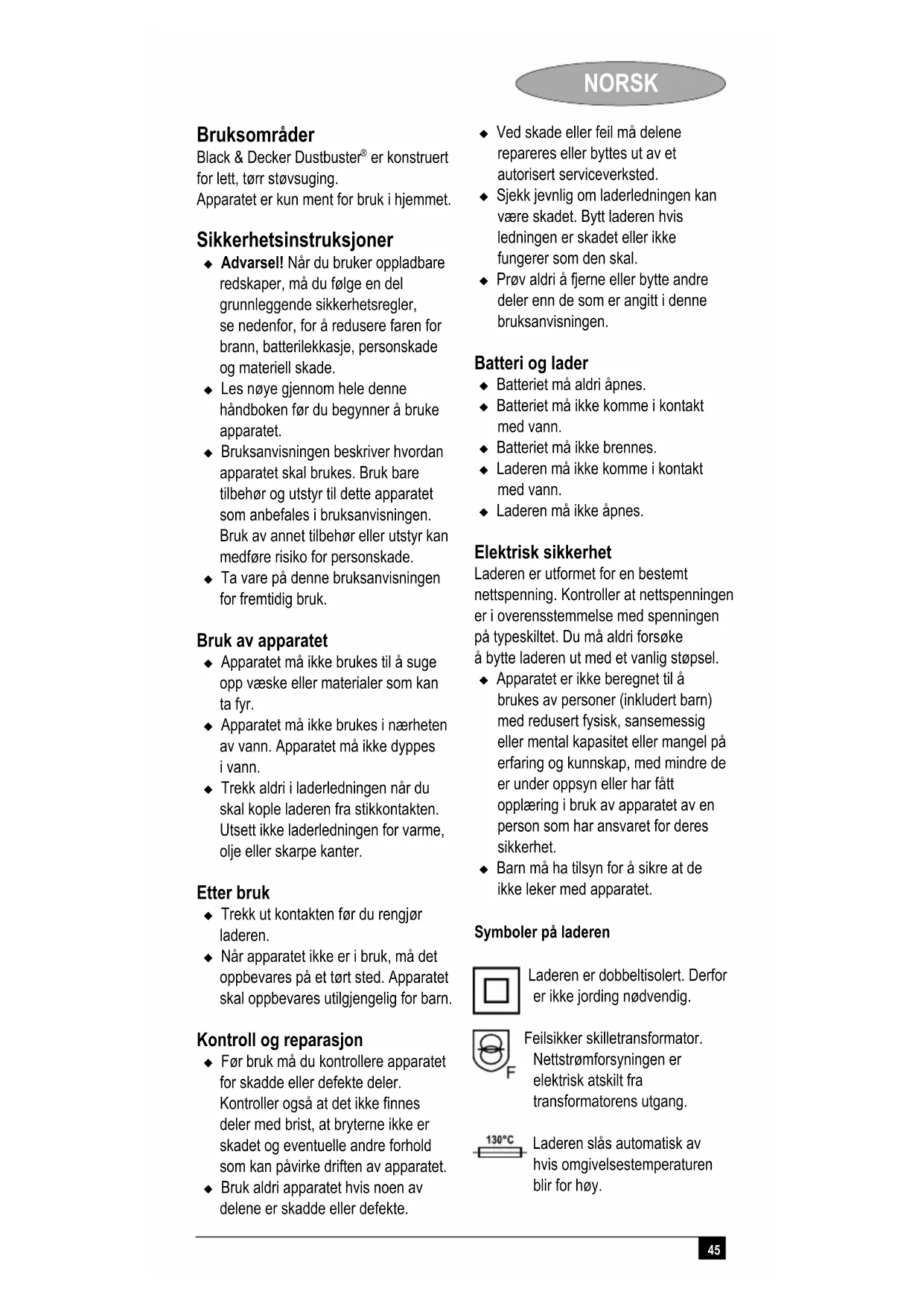 er konstruert for lett, tørr støvsuging. Apparatet er kun ment for bruk i hjemmet. Sikkerhetsinstruksjoner Advarsel! Når du bruker oppladbare redskaper, må du følge en del grunnleggende sikkerhetsregler, se nedenfor, for å redusere faren for brann, batterilekkasje, personskade og materiell skade. Les nøye gjennom hele denne håndboken før du begynner å bruke apparatet. Bruksanvisningen beskriver hvordan apparatet skal brukes. Bruk bare tilbehør og utstyr til dette apparatet som anbefales i bruksanvisningen. Bruk av annet tilbehør eller utstyr kan medføre risiko for personskade. Ta vare på denne bruksanvisningen for fremtidig bruk. Bruk av apparatet Apparatet må ikke brukes til å suge opp væske eller materialer som kan ta fyr. Apparatet må ikke brukes i nærheten av vann. Apparatet må ikke dyppes i vann. Trekk aldri i laderledningen når du skal kople laderen fra stikkontakten. Utsett ikke laderledningen for varme, olje eller skarpe kanter. Etter bruk Trekk ut kontakten før du rengjør laderen. Når apparatet ikke er i bruk, må det oppbevares på et tørt sted. Apparatet skal oppbevares utilgjengelig for barn. Kontroll og reparasjon Før bruk må du kontrollere apparatet for skadde eller defekte deler. Kontroller også at det ikke finnes deler med brist, at bryterne ikke er skadet og eventuelle andre forhold som kan påvirke driften av apparatet. Bruk aldri apparatet hvis noen av delene er skadde eller defekte. Ved skade eller feil må delene repareres eller byttes ut av et autorisert serviceverksted. Sjekk jevnlig om laderledningen kan være skadet. Bytt laderen hvis ledningen er skadet eller ikke fungerer som den skal. Prøv aldri å fjerne eller bytte andre deler enn de som er angitt i denne bruksanvisningen. Batteri og lader Batteriet må aldri åpnes. Batteriet må ikke komme i kontakt med vann. Batteriet må ikke brennes. Laderen må ikke komme i kontakt med vann. Laderen må ikke åpnes. Elektrisk sikkerhet Laderen er utformet for en bestemt nettspenning. Kontroller at nettspenningen er i overensstemmelse med spenningen på typeskiltet. Du må aldri forsøke å bytte laderen ut med et vanlig støpsel. Apparatet er ikke beregnet til å brukes av personer (inkludert barn) med redusert fysisk, sansemessig eller mental kapasitet eller mangel på erfaring og kunnskap, med mindre de er under oppsyn eller har fått opplæring i bruk av apparatet av en person som har ansvaret for deres sikkerhet. Barn må ha tilsyn for å sikre at de ikke leker med apparatet. Symboler på laderen Laderen er dobbeltisolert. Derfor er ikke jording nødvendig. Feilsikker skilletransformator. Nettstrømforsyningen er elektrisk atskilt fra transformatorens utgang. Laderen slås automatisk av hvis omgivelsestemperaturen blir for høy.46 NORSK Følgelig vil det ikke være mulig å bruke laderen. Enheten må kobles fra strømnettet og leveres inn til reparasjon i et autorisert servicesenter. Laderen er kun beregnet på innendørs bruk. Les nøye gjennom hele håndboken før du begynner å bruke apparatet. Advarsel! Hold elektriske apparater utenfor rekkevidde for barn og ustabile personer. Ikke la dem bruke apparatene uten tilsyn. Egenskaper