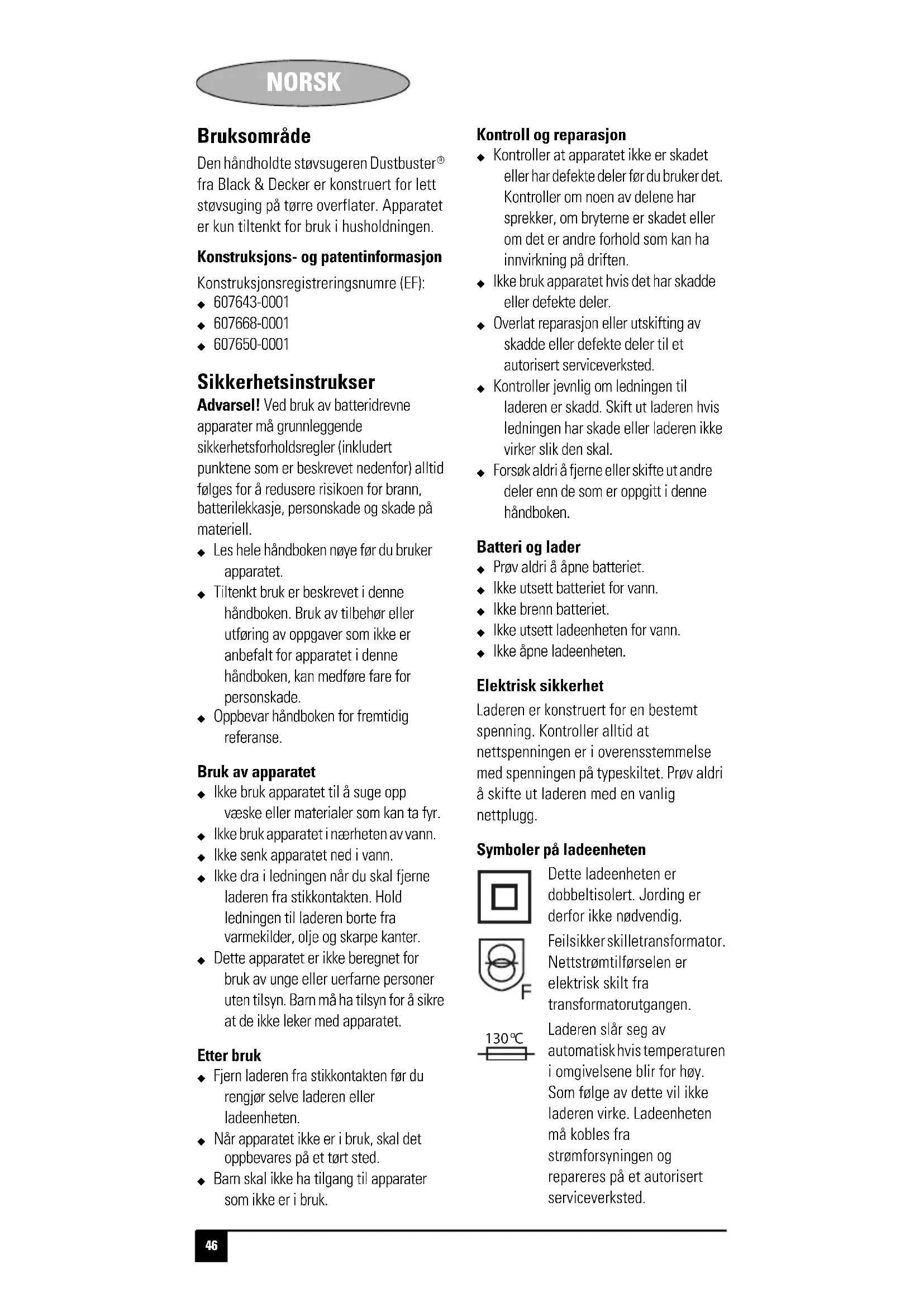 fra Black & Decker er konstruert for lett støvsuging på tørre overflater. Apparatet er kun tiltenkt for bruk i husholdningen. Konstruksjons- og patentinformasjon Konstruksjonsregistreringsnumre (EF): X 607643-0001X 607668-0001X 607650-0001 Sikkerhetsinstrukser Advarsel! Ved bruk av batteridrevne apparater må grunnleggende sikkerhetsforholdsregler (inkludert punktene som er beskrevet nedenfor) alltid følges for å redusere risikoen for brann, batterilekkasje, personskade og skade på materiell. X Les hele håndboken nøye før du bruker apparatet. X Tiltenkt bruk er beskrevet i denne håndboken. Bruk av tilbehør eller utføring av oppgaver som ikke er anbefalt for apparatet i denne håndboken, kan medføre fare for personskade. X Oppbevar håndboken for fremtidig referanse. Bruk av apparatet X Ikke bruk apparatet til å suge opp væske eller materialer som kan ta fyr. X Ikke bruk apparatet i nærheten av vann. X Ikke senk apparatet ned i vann.X Ikke dra i ledningen når du skal fjerne laderen fra stikkontakten. Hold ledningen til laderen borte fra varmekilder, olje og skarpe kanter. X Dette apparatet er ikke beregnet for bruk av unge eller uerfarne personer uten tilsyn. Barn må ha tilsyn for å sikre at de ikke leker med apparatet. Etter bruk X Fjern laderen fra stikkontakten før du rengjør selve laderen eller ladeenheten. X Når apparatet ikke er i bruk, skal det oppbevares på et tørt sted. X Barn skal ikke ha tilgang til apparater som ikke er i bruk. Kontroll og reparasjon X Kontroller at apparatet ikke er skadet eller har defekte deler før du bruker det. Kontroller om noen av delene har sprekker, om bryterne er skadet eller om det er andre forhold som kan ha innvirkning på driften. X Ikke bruk apparatet hvis det har skadde eller defekte deler. X Overlat reparasjon eller utskifting av skadde eller defekte deler til et autorisert serviceverksted. X Kontroller jevnlig om ledningen til laderen er skadd. Skift ut laderen hvis ledningen har skade eller laderen ikke virker slik den skal. X Forsøk aldri å fjerne eller skifte ut andre deler enn de som er oppgitt i denne håndboken. Batteri og lader X Prøv aldri å åpne batteriet. X Ikke utsett batteriet for vann. X Ikke brenn batteriet. X Ikke utsett ladeenheten for vann. X Ikke åpne ladeenheten. Elektrisk sikkerhet Laderen er konstruert for en bestemt spenning. Kontroller alltid at nettspenningen er i overensstemmelse med spenningen på typeskiltet. Prøv aldri å skifte ut laderen med en vanlig nettplugg. Symboler på ladeenheten Dette ladeenheten er dobbeltisolert. Jording er derfor ikke nødvendig. Feilsikker skilletransformator. Nettstrømtilførselen er elektrisk skilt fra transformatorutgangen. Laderen slår seg av automatisk hvis temperaturen i omgivelsene blir for høy. Som følge av dette vil ikke laderen virke. Ladeenheten må kobles fra strømforsyningen og repareres på et autorisert serviceverksted.