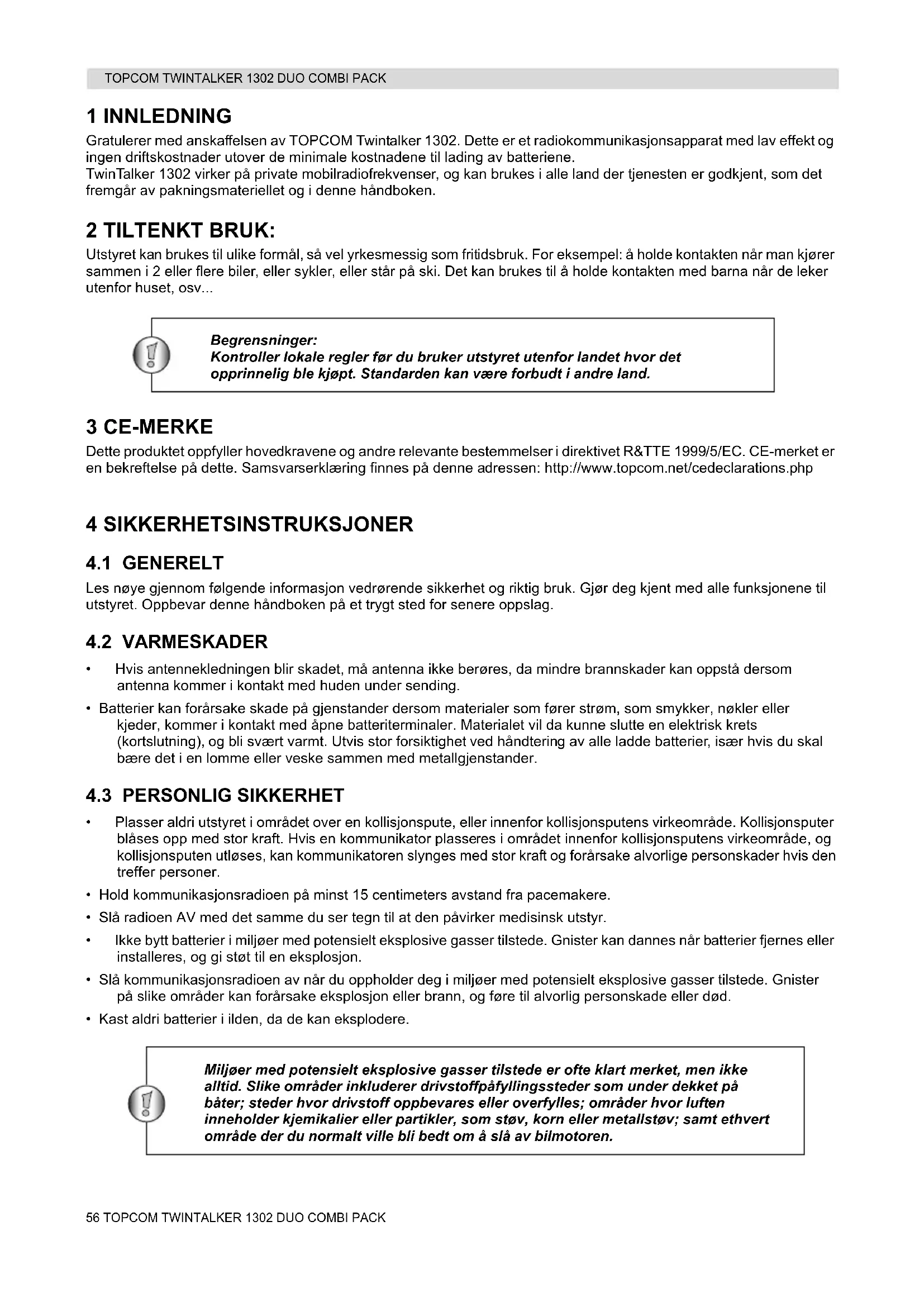 - Kast aldri batterier i ilden, da de kan eksplodere. Begrensninger: Kontroller lokale regler før du bruker utstyret utenfor landet hvor det opprinnelig ble kjøpt. Standarden kan være forbudt i andre land. Miljøer med potensielt eksplosive gasser tilstede er ofte klart merket, men ikke alltid. Slike områder inkluderer drivstoffpåfyllingssteder som under dekket på båter; steder hvor drivstoff oppbevares eller overfylles; områder hvor luften inneholder kjemikalier eller partikler, som støv, korn eller metallstøv; samt ethvert område der du normalt ville bli bedt om å slå av bilmotoren. HL_TT1302 Duo Combi Pack D63.book Page 56 Sunday, June 5, 2011 10:11 PMTOPCOM TWINTALKER 1302 DUO COMBI PACK 57TOPCOM TWINTALKER 1302 DUO COMBI PACK NORSK