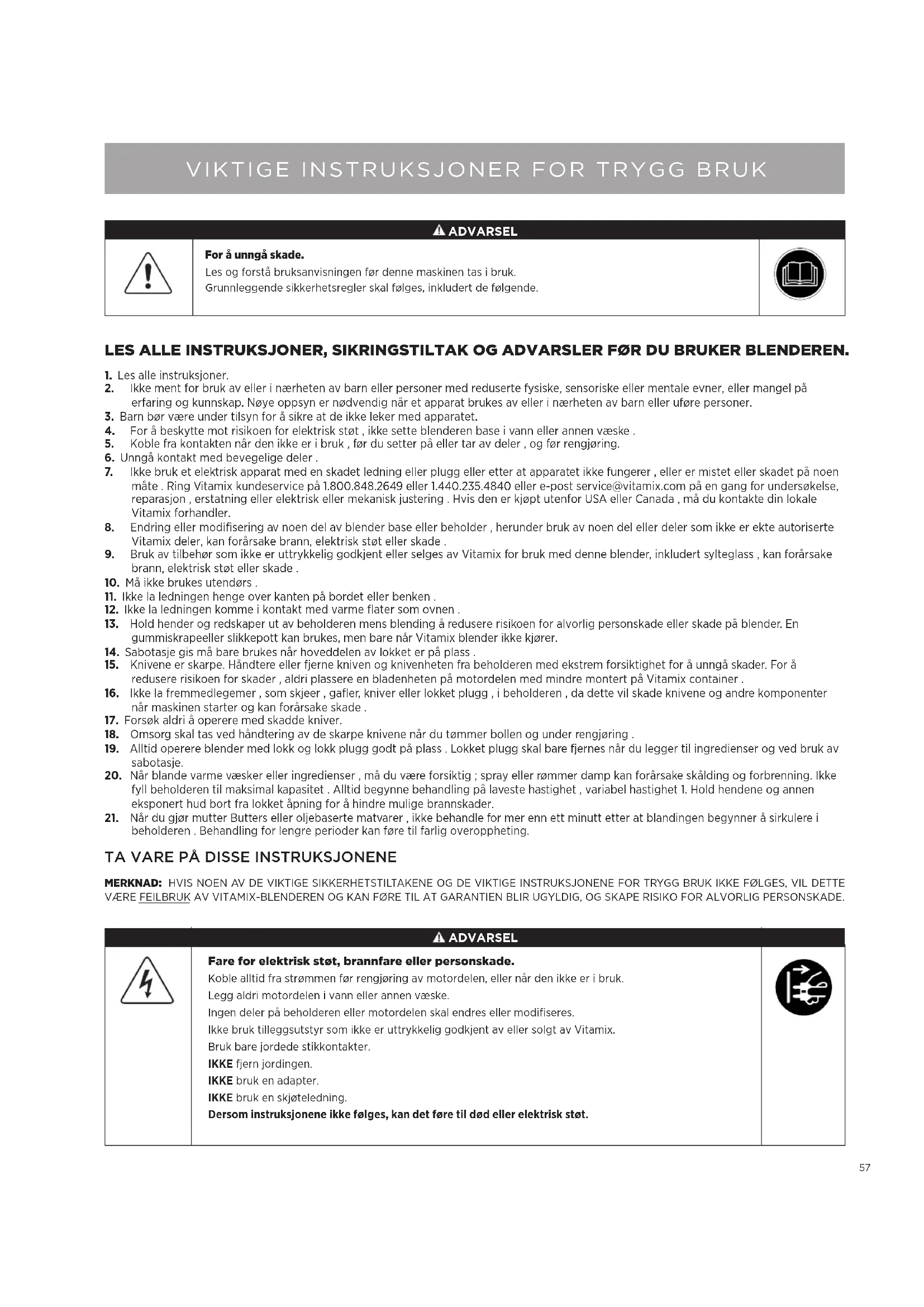 7. Ikke bruk et elektrisk apparat med en skadet ledning eller plugg eller etter at apparatet ikke fungerer , eller er mistet eller skadet på noen måte . Ring Vitamix kundeservice på 1.800.848.2649 eller 1.440.235.4840 eller e-post service@vitamix.com på en gang for undersøkelse, reparasjon , erstatning eller elektrisk eller mekanisk justering . Hvis den er kjøpt utenfor USA eller Canada , må du kontakte din lokale Vitamix forhandler. 8. Endring eller modifisering av noen del av blender base eller beholder , herunder bruk av noen del eller deler som ikke er ekte autoriserte Vitamix deler, kan forårsake brann, elektrisk støt eller skade . 9. Bruk av tilbehør som ikke er uttrykkelig godkjent eller selges av Vitamix for bruk med denne blender, inkludert sylteglass , kan forårsake brann, elektrisk støt eller skade .
