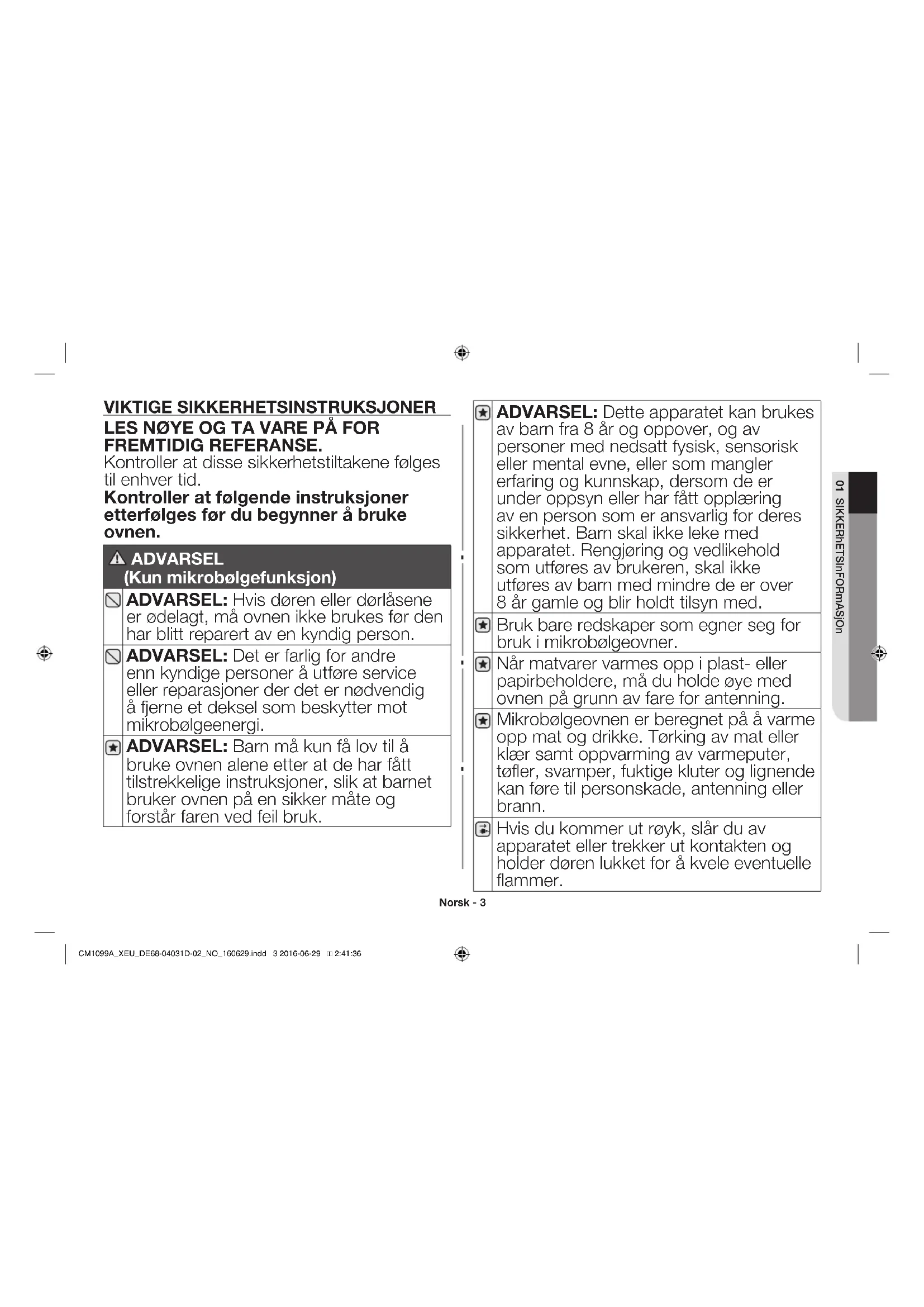 ADVARSEL Farer eller usikker bruk som kan føre til alvorlige personskader eller død. FORSIKTIG Farer eller usikker bruk som kan føre til mindre personskader eller skader på gjenstander. Advarsel: Brannfare Advarsel: Varm overflate Advarsel: Strøm Advarsel: Eksplosivt materiale IKKE prøv dette. Må IKKE røres. Må IKKE demonteres. Følg instruksjonene nøye. Trekk ut støpselet fra kontakten. Sørg for at maskinen er jordet slik at du unngå støt. Ta kontakt med servicesenteret for hjelp. Merknad Viktig VIKTIGE SIKKERHETSINSTRUKSJONER LES NØYE OG TA VARE PÅ FOR FREMTIDIG REFERANSE. Kontroller at disse sikkerhetstiltakene følges til enhver tid. Kontroller at følgende instruksjoner etterfølges før du begynner å bruke ovnen. ADVARSEL (Kun mikrobølgefunksjon) ADVARSEL: Hvis døren eller dørlåsene er ødelagt, må ovnen ikke brukes før den har blitt reparert av en kyndig person. ADVARSEL: Det er farlig for andre enn kyndige personer å utføre service eller reparasjoner der det er nødvendig å fjerne et deksel som beskytter mot mikrobølgeenergi. ADVARSEL: Barn må kun få lov til å bruke ovnen alene etter at de har fått tilstrekkelige instruksjoner, slik at barnet bruker ovnen på en sikker måte og forstår faren ved feil bruk. CM1099A_XEU_DE68-04031D-02_NO_160629.indd 2 2016-06-29 2:41:35Norsk - 2 Norsk - 3 01 SIKKERhETSInFORmASjOn sikkerhetsinformasjon