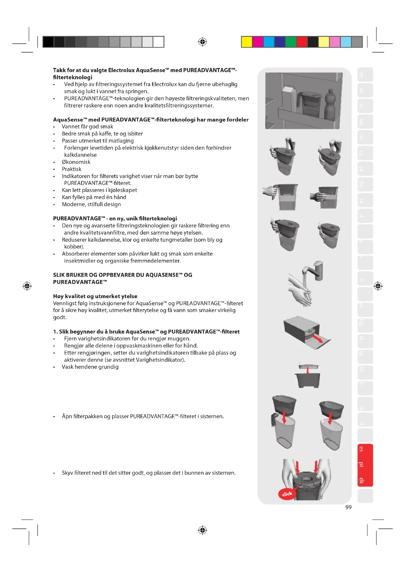 Vennligst følg instruksjonene for AquaSense™ og PUREADVANTAGE™-filteret for á sikre høy kvalitet, utmerket filternytelse og fã vann som smaker virkelig godt.
