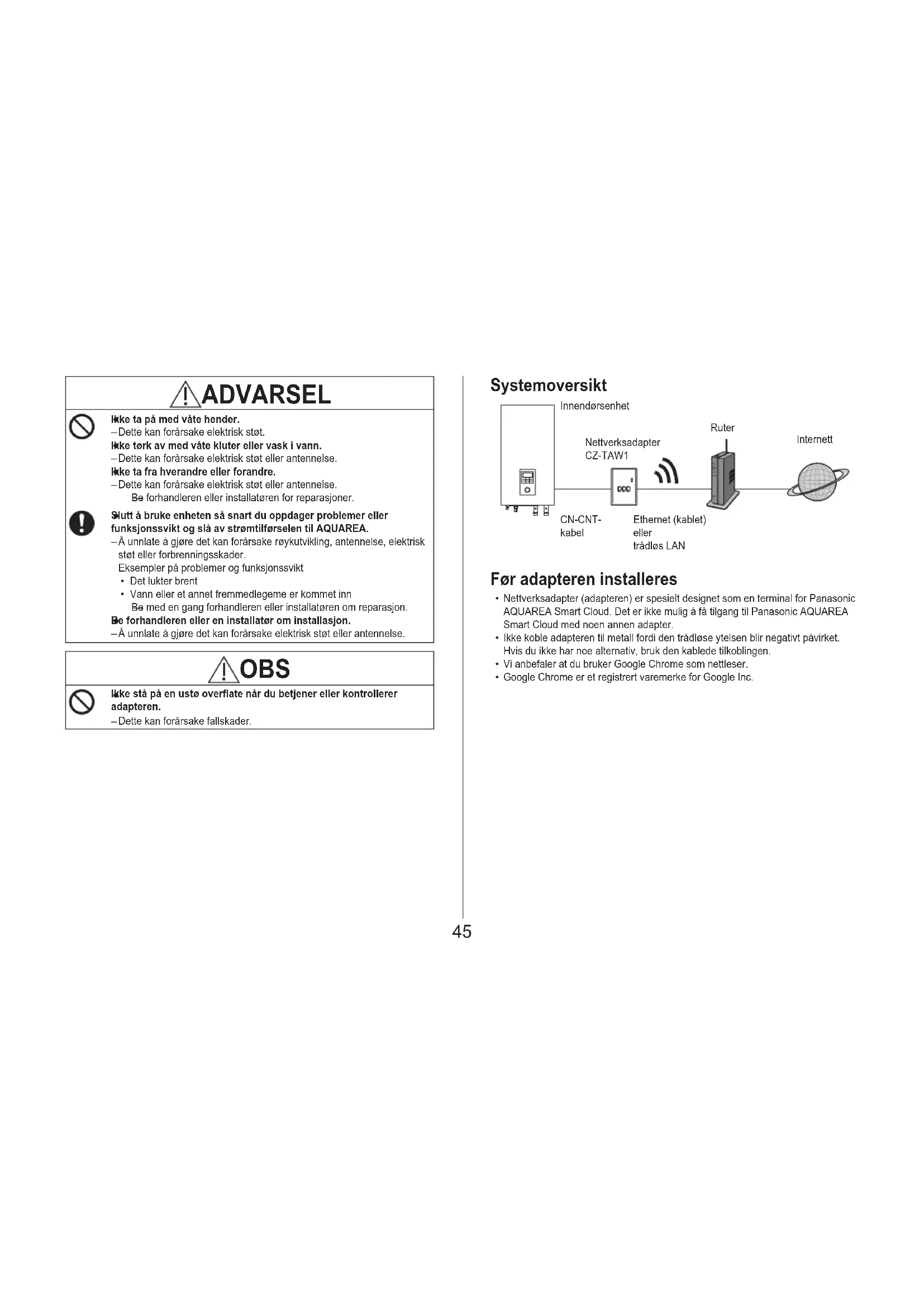 Nettverksadapter (adapteren) er spesielt designet som en terminal for Panasonic AQUAREA Smart Cloud. Det er ikke mulig å få tilgang til Panasonic AQUAREA Smart Cloud med noen annen adapter.