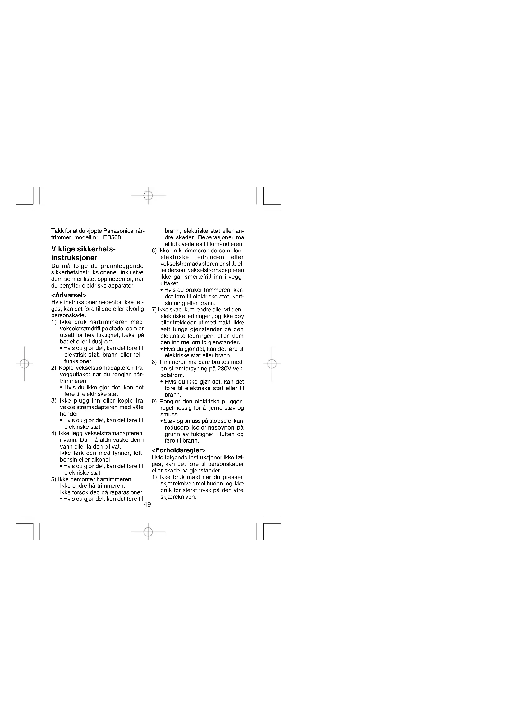Takk for at du kjøpte Panasonics hår- trimmer, modell nr. .ER508. Viktige sikkerhets- instruksjoner Du må følge de grunnleggende sikkerhetsinstruksjonene, inklusive dem som er listet opp nedenfor, når du benytter elektriske apparater. <Advarsel> Hvis instruksjoner nedenfor ikke føl- ges, kan det føre til død eller alvorlig personskade.