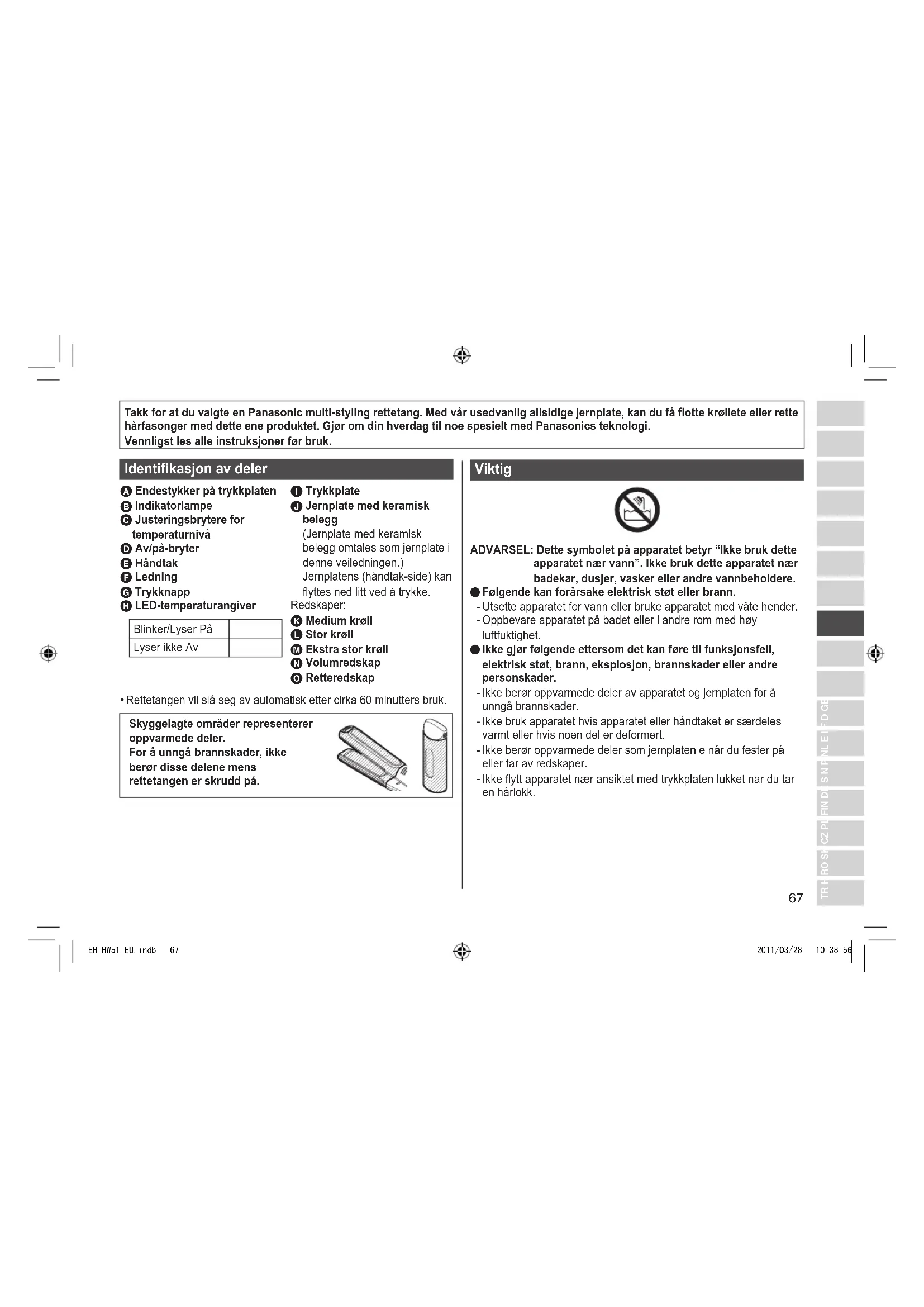 EH-HW51_EU.indb 66 2011/03/28 10:38:5667 TR H RO SK CZ PL FIN DK S N P NL E I F D GB Takk for at du valgte en Panasonic multi-styling rettetang. Med vår usedvanlig allsidige jernplate, kan du få otte krøllete eller rette hårfasonger med dette ene produktet. Gjør om din hverdag til noe spesielt med Panasonics teknologi. Vennligst les alle instruksjoner før bruk. Identikasjon av deler