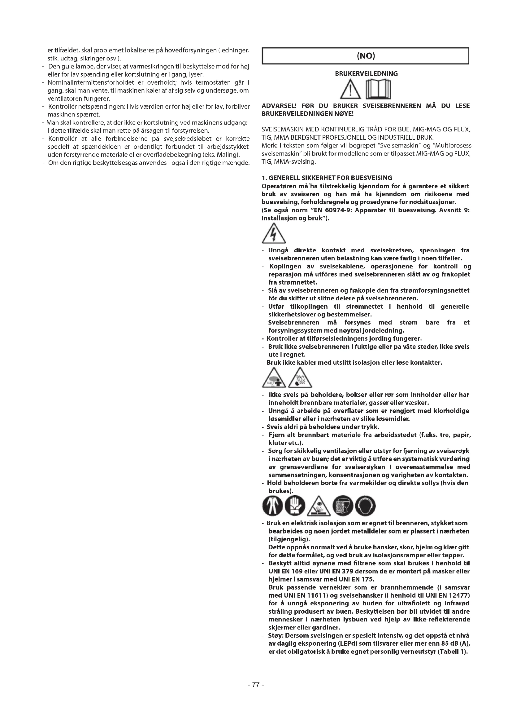 Operatøren må´ha tilstrekkelig kjenndom for å garantere et sikkert bruk av sveiseren og han må ha kjenndom om risikoene med buesveising, forholdsregnele og prosedyrene for nødsituasjoner. (Se også norm ”EN 60974-9: Apparater til buesveising. Avsnitt 9: Installasjon og bruk”). - Unngå direkte kontakt med sveisekretsen, spenningen fra sveisebrenneren uten belastning kan være farlig i noen tilfeller. - Koplingen av sveisekablene, operasjonene for kontroll og reparasjon må utföres med sveisebrenneren slått av og frakoplet fra strømnettet. - Slå av sveisebrenneren og frakople den fra strømforsyningsnettet för du skifter ut slitne delere på sveisebrenneren. - Utfør tilkoplingen til strømnettet i henhold til generelle sikkerhetslover og bestemmelser. - Sveisebrenneren må forsynes med strøm bare fra et forsyningssystem med nøytral jordeledning. - Kontroller at tilførselsledningens jording fungerer. - Bruk ikke sveisebrenneren i fuktige eller på våte steder, ikke sveis ute i regnet. - Bruk ikke kabler med utslitt isolasjon eller løse kontakter. - Ikke sveis på beholdere, bokser eller rør som innholder eller har inneholdt brennbare materialer, gasser eller væsker. - Unngå å arbeide på overater som er rengjort med klorholdige løsemidler eller i nærheten av slike løsemidler. - Sveis aldri på beholdere under trykk. - Fjern alt brennbart materiale fra arbeidsstedet (f.eks. tre, papir, kluter etc.). - Sørg for skikkelig ventilasjon eller utstyr for erning av sveiserøyk i nærheten av buen; det er viktig å utføre en systematisk vurdering av grenseverdiene for sveiserøyken I overensstemmelse med sammensetningen, konsentrasjonen og varigheten av kontakten. - Hold beholderen borte fra varmekilder og direkte sollys (hvis den brukes). - Bruk en elektrisk isolasjon som er egnet til brenneren, stykket som bearbeides og noen jordet metalldeler som er plassert i nærheten (tilgjengelig). Dette oppnås normalt ved å bruke hansker, skor, hjelm og klær gitt for dette formålet, og ved bruk av isolasjonsramper eller tepper. - Beskytt alltid øynene med ltrene som skal brukes i henhold til UNI EN 169 eller UNI EN 379 dersom de er montert på masker eller hjelmer i samsvar med UNI EN 175. Bruk passende verneklær som er brannhemmende (i samsvar med UNI EN 11611) og sveisehansker (i henhold til UNI EN 12477) for å unngå eksponering av huden for ultraolett og infrarød stråling produsert av buen. Beskyttelsen bør bli utvidet til andre mennesker i nærheten lysbuen ved hjelp av ikke-reekterende skjermer eller gardiner. - Støy: Dersom sveisingen er spesielt intensiv, og det oppstå et nivå av daglig eksponering (LEPd) som tilsvarer eller mer enn 85 dB (A), er det obligatorisk å bruke egnet personlig verneutstyr (Tabell 1).- 78 - - Overgangen av sveisespenningen fører til elektromagnetiske felt (EMF) ved sveisekretsen. De elektromagnetiske feltene kan interferire med noen medisinske apparater (f.eks. pace-maker, åndningsmaskiner, metallproteser etc.). Det er nødvendig å utføre verneprosedyrer for personene som skal ha på seg disse apparatene. For eksempel skal de ikke gå bort i sveiserens bruksområde. Denne sveisebrenneren oppfyller kravene for produktets tekniske standard for eksklusiv bruk i industrimiljøer og for profesjonal anvendelse. Vi garanterer ikke overensstemmelse med grenseverdiene når det gjelder kontakt med elektromagnetiske felt i hjemmet for mennesker. Operatøren skal bruke følgende prosedyrer for å minke all kontakt med elektromagnetiske felt: - Installer de to sveisekablene så nære hverandre som mulig. - Hold hodet og kroppen så langt borte som mulig från sveisekretsen. - Linde aldrig sveisekablene rundt kroppen. - Du skal aldri sveise med kroppen i sveisekretsen. Hold begge kablene på samme side av kroppen. - Kople returkabeln for sveisespenningen til stykket som skal sveises så nære soms mulig til skjøten som skal dannes. - Du skal ikke sveise ved å oppholde deg eller støtte deg ved helt nære sveisebrenneren (mindste avstand: 50cm). - La aldrig magnetiske formål av jern være i nærheten av sveisekretsen. - Mindste avstand d=20cm (Fig. G). - Apparat av klasse A: Denne sveisebrenneren oppfyller kravene for produktets tekniske standard for eksklusiv bruk i industrimiljøer og for profesjonal anvendelse. Vi garanterer ikke overensstemmelse med den elektromagnetiske overensstemmelsen i bygninger med leiligheter eller i bygninger som er direkt koplet til et forsyningsnett med lav spenning som forsyner bygningene med leiligheter. EKSTRA FORHOLDSREGLER - SVEISEOPERASJONER: - I miljöer med stor risiko for elektrisk støt; - I avgrenset mijøer; - I nærvær av lettantennelige eller esplosive materialer; MÅ de først bli vurdert av en “Ansvarlig ekspert” og siden bli fullført i nærvær av andre personer med nødvendige kjenndommer i fall av nødsituasjoner. Man MÅ bruke de tekniske vernesystemene som er beskrvete i 7.10; A.8; A.10 i normen ”EN 60974-9: Apparater til buesveising. Avsnitt 9: Installasjon og bruk”. - Sveisingen MÅ være forbudt mens sveiseren eller trådfører holdes av operatøren (f.eks. ved hjelp av remmer). - Det er forbudt å svelse med operatøren oppløft fra gulvet, med unntak av eventuelt bruk av sikkerhetsramper. - SPENNING MELLOM ELEKTRODHOLDER ELLER BRENNER: hvis du arbeider med ere sveiserer på en del eller på deler som er koplet mellom hverandre på elektrisk måte, kan farlig elektrisitet på tomgang oppstå mellom de ulike elektrodholdere eller brennere, med et verdi som kan være dobbelt så stort i henhold til tillatt grenseverdi. Det er nødvendig at en organisatør med erfareinger avgjør hvis der er noen risikoer, slik at man kan bruke verneutstyr som er egnet, i samsvar med 7.9 i normen ”EN 60974-9: Apparater til buesveising. Avsnitt 9: Installasjon og bruk”. ANDRE RISIKOER - VELTING: plasser sveiseren på en horisontal overate med lempelig kapasitet i henhold til massen; ellers 